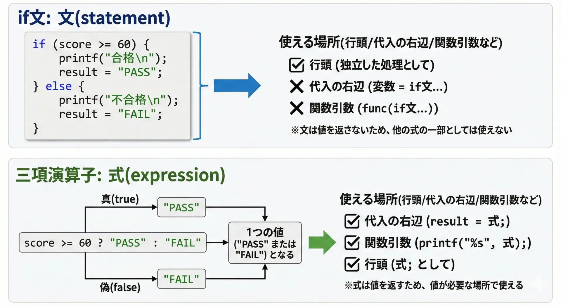 if文と三項演算子は見た目も役割も似ていますが、構文の性質が根本的に違うことを理解しておくことが大切です。