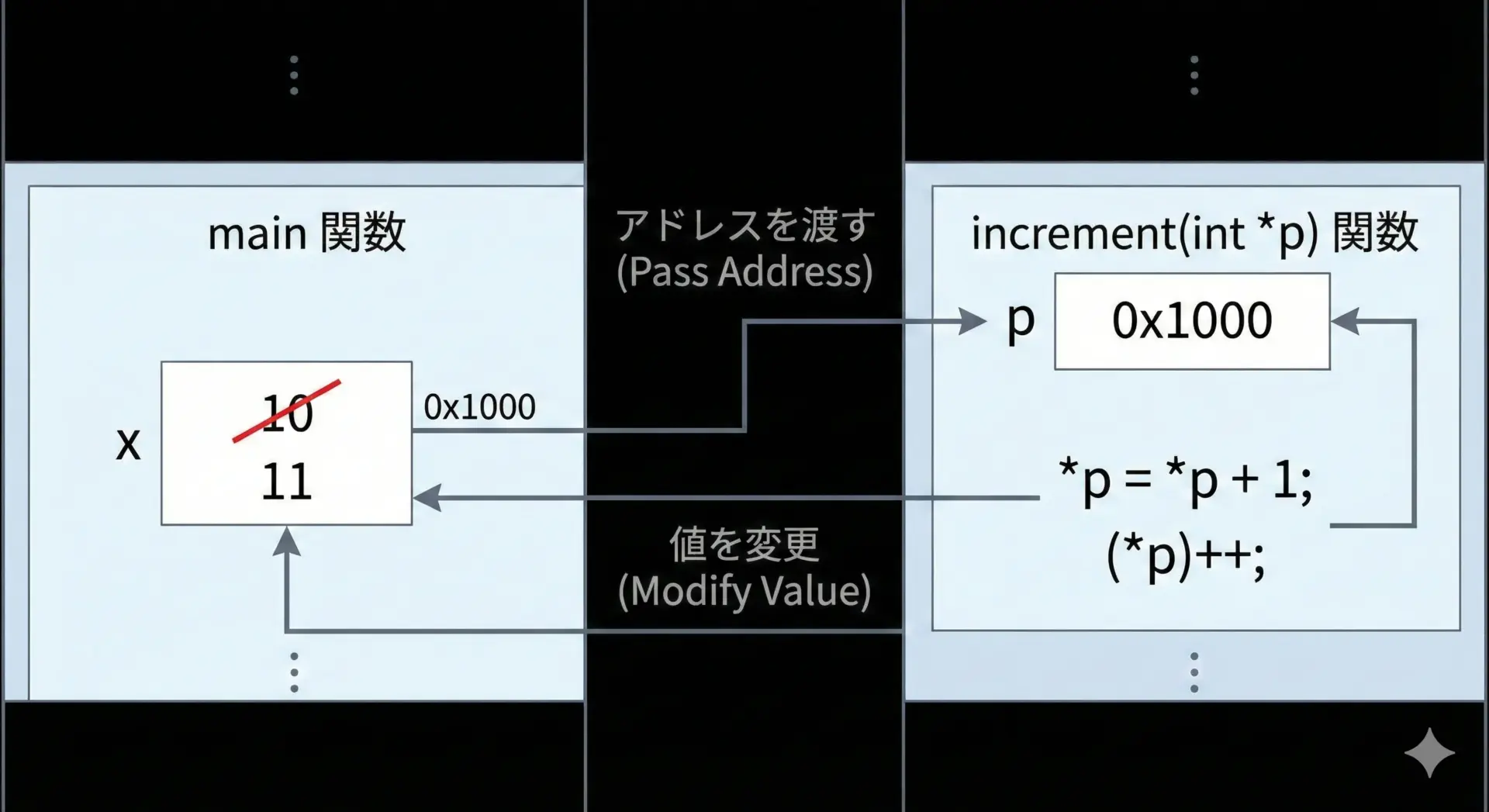 ポイントは、ポインタは「値ではなく場所(アドレス)を扱う変数」であり、& と * はその場所と中身を行き来するための操作だということです。