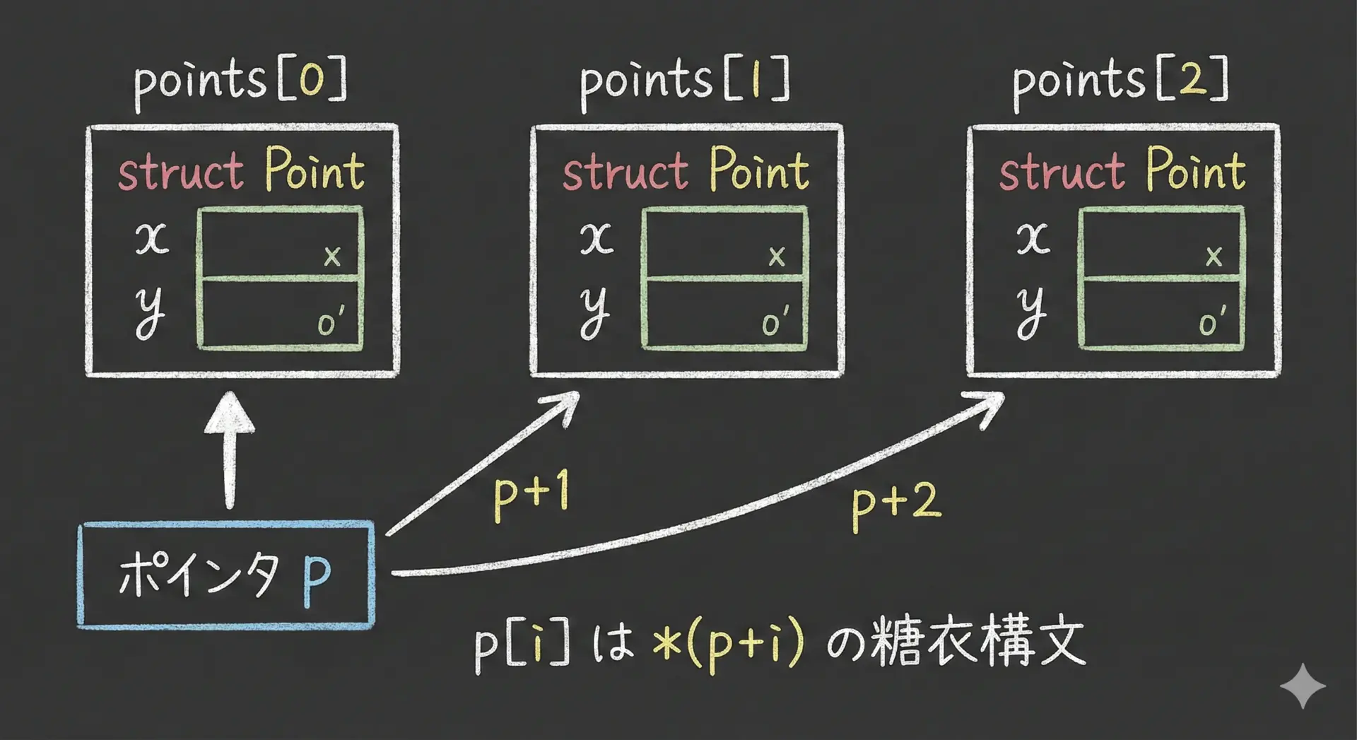 配列名が先頭要素へのポインタとして振る舞うこと、関数や構造体とも自然に結びつくことが分かれば、ポインタは怖いものではなくなります。