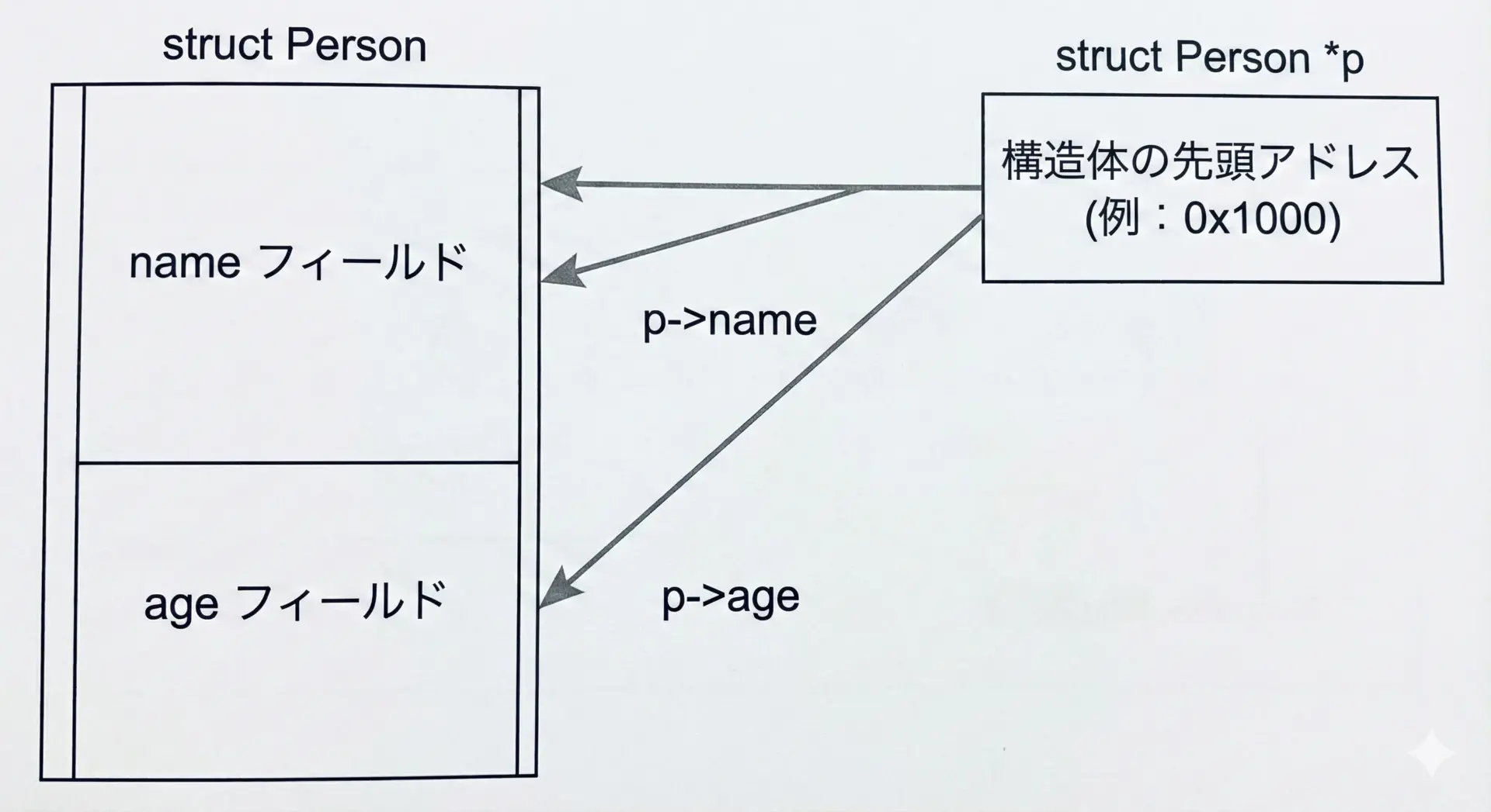 printf("name: %s, age: %d\n", p->name, p->age); // -> 演算子で簡略化