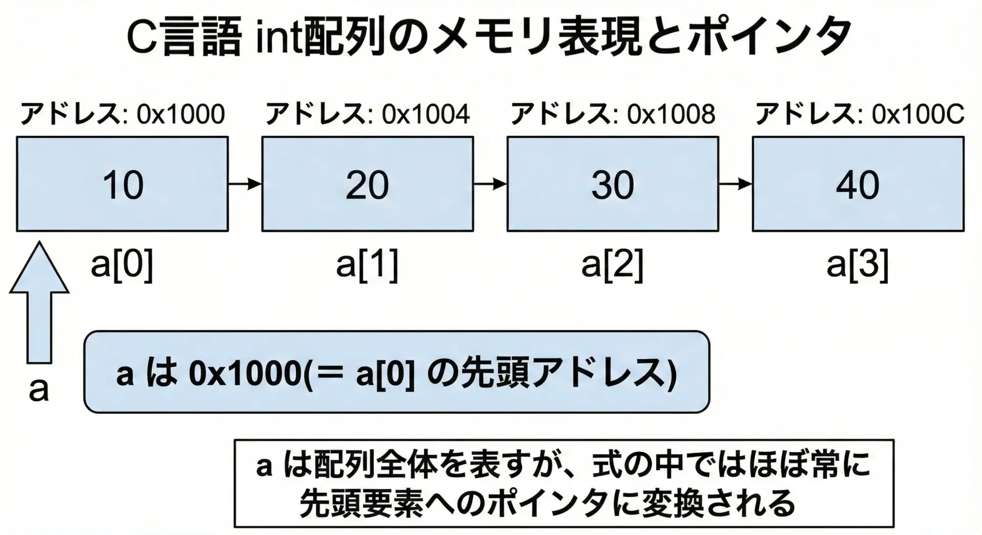 C言語では、aのような配列名は、多くの場面で「先頭要素のアドレス」として扱われます。