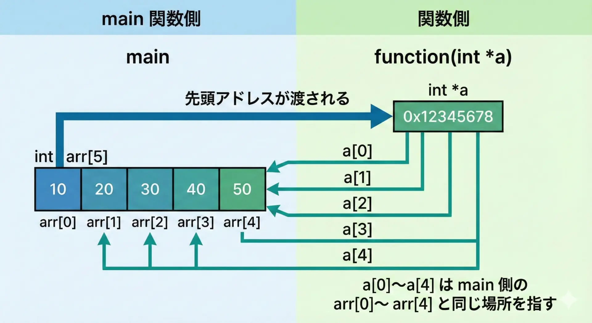 ここを押さえておくと、文字列や関数への配列渡しがぐっと分かりやすくなります。