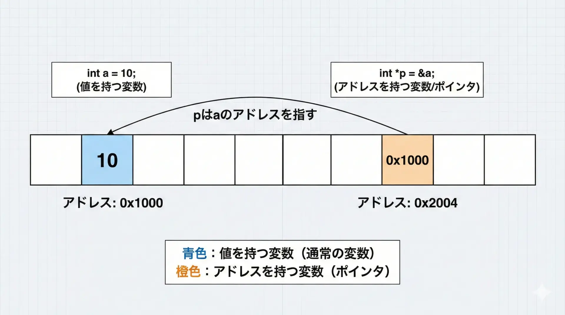 通常の変数は「データの箱」そのもの、ポインタは「箱への住所メモ」と考えると区別しやすくなります。