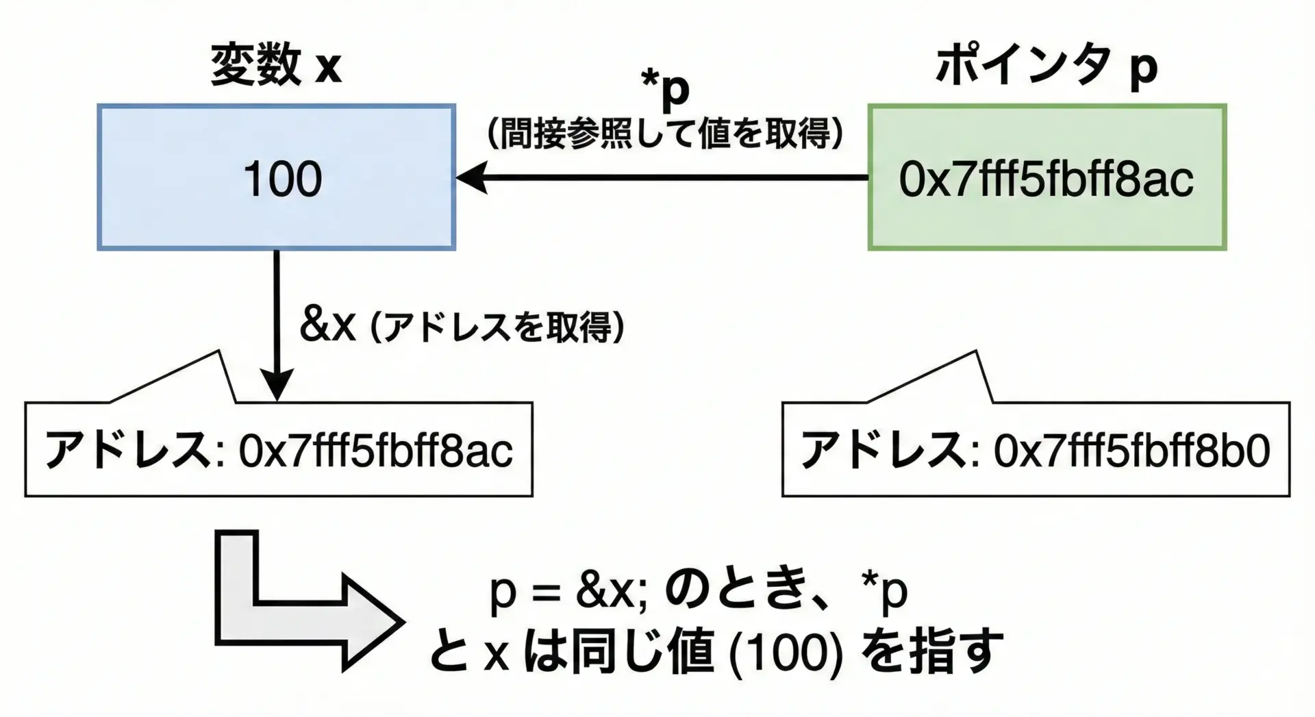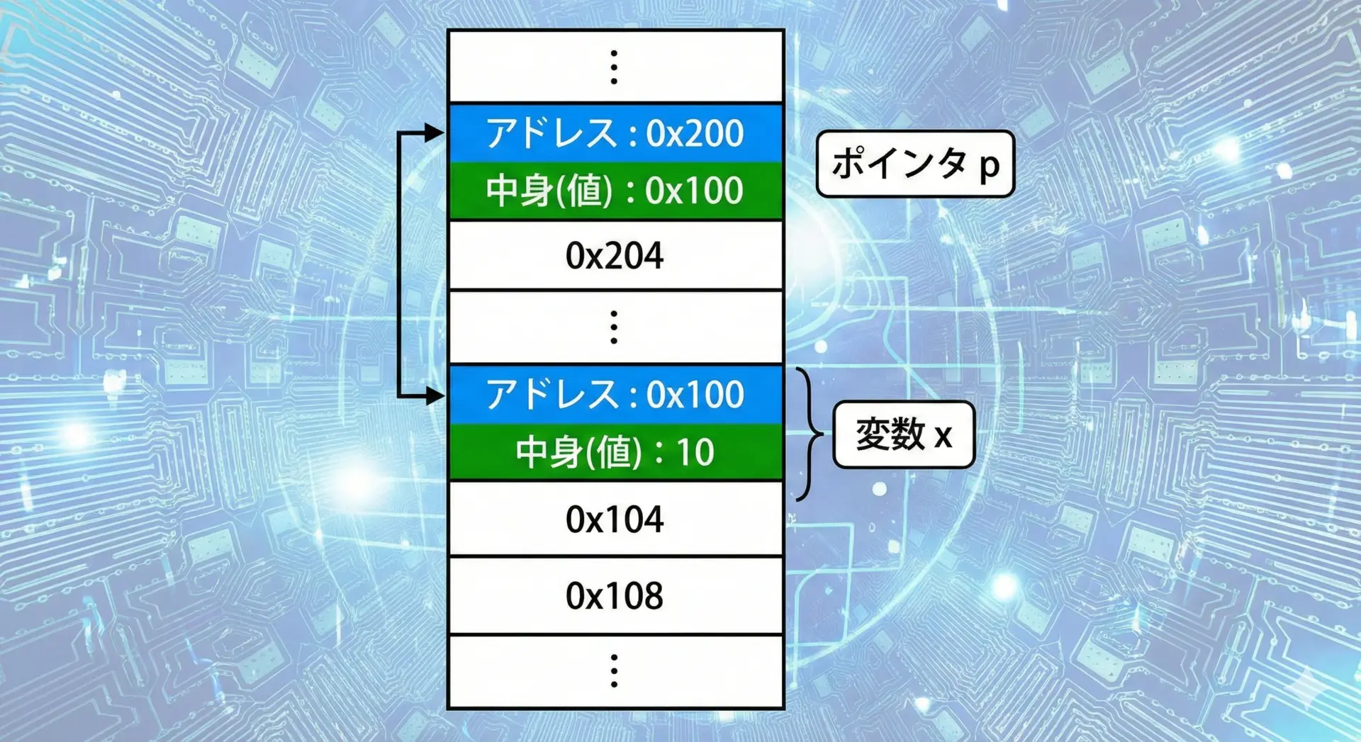 ポインタ変数pの「値」そのものが、他の変数(x)の「アドレス」になるという点が最重要ポイントです。