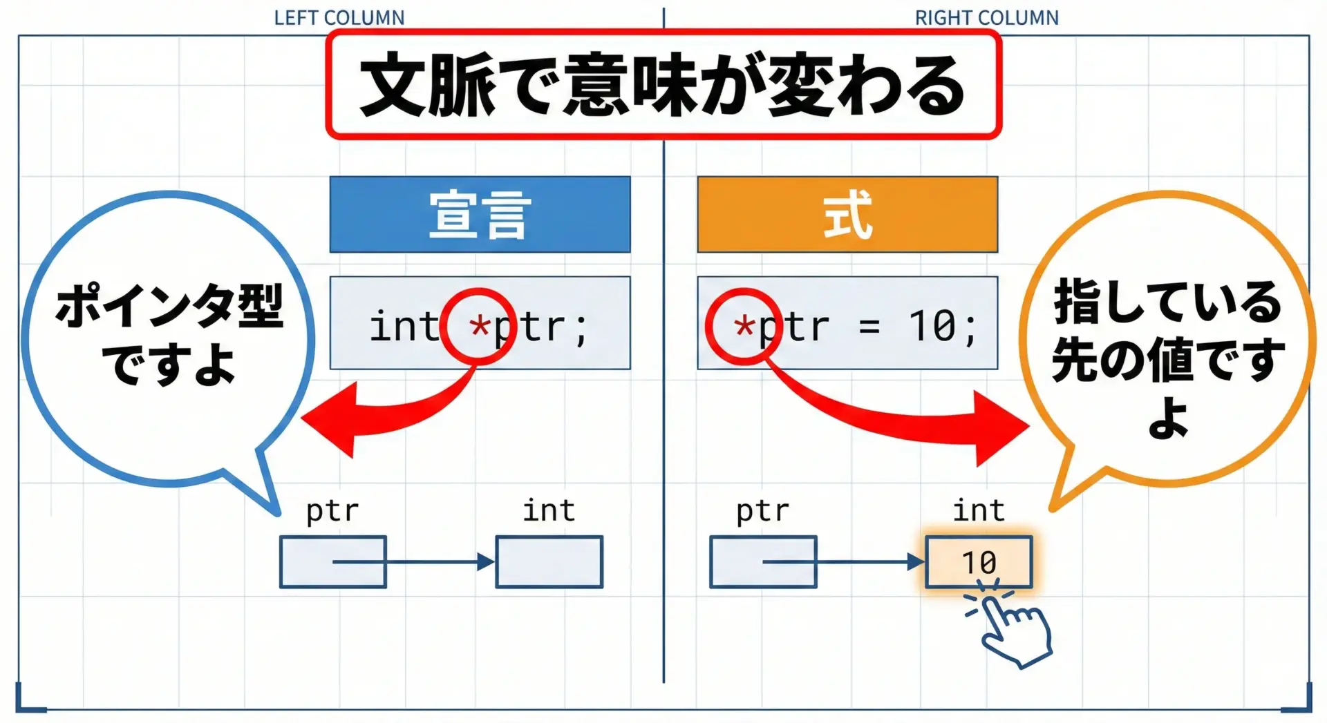 このように、同じ*でも、どこに書かれているか(宣言か式か)で意味が変わることが分かります。