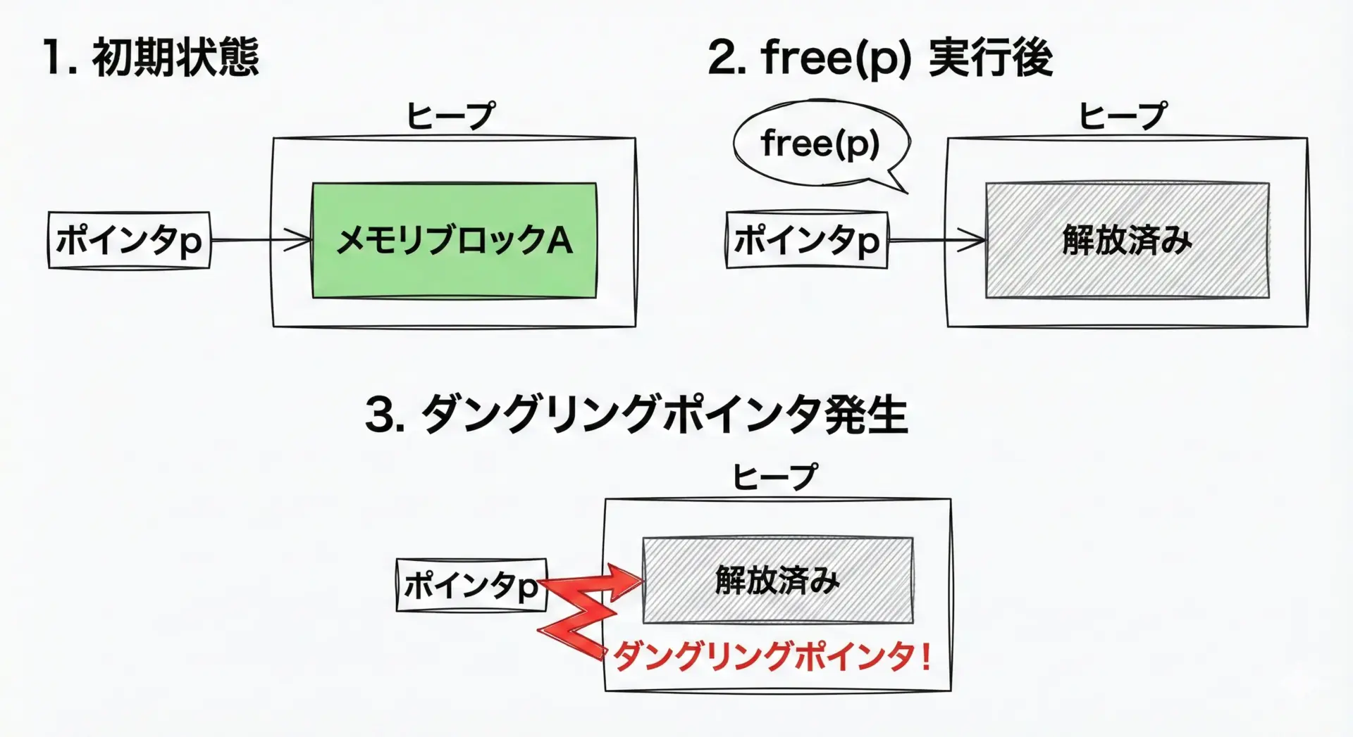 ダングリングポインタはNULLではなく、「見かけ上はそれらしいアドレスを持っているが、実際には無効」という非常に危険な状態です。
