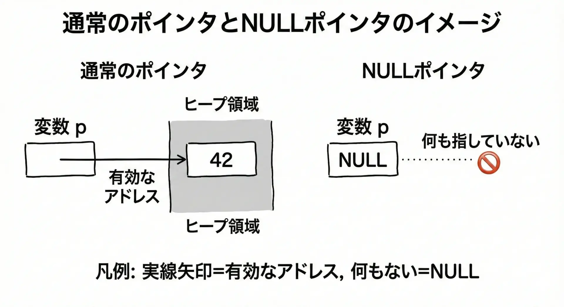 この図のように、通常のポインタはメモリ上のどこかを指していますが、NULLポインタは「どこも指していない」ことを明示する値です。