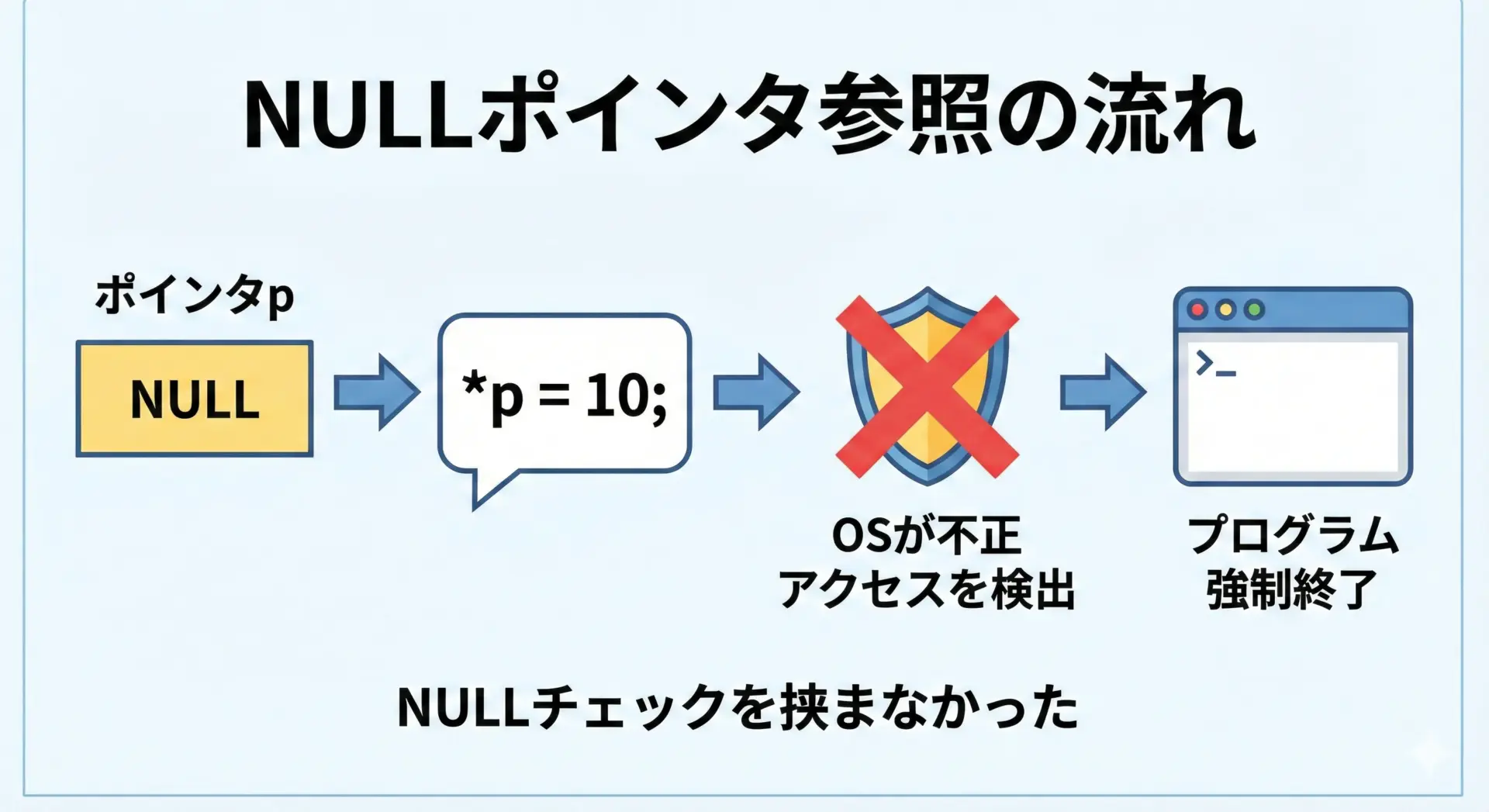 NULLを正しく理解していないと、クラッシュやメモリ破壊など重大なバグの原因になります。