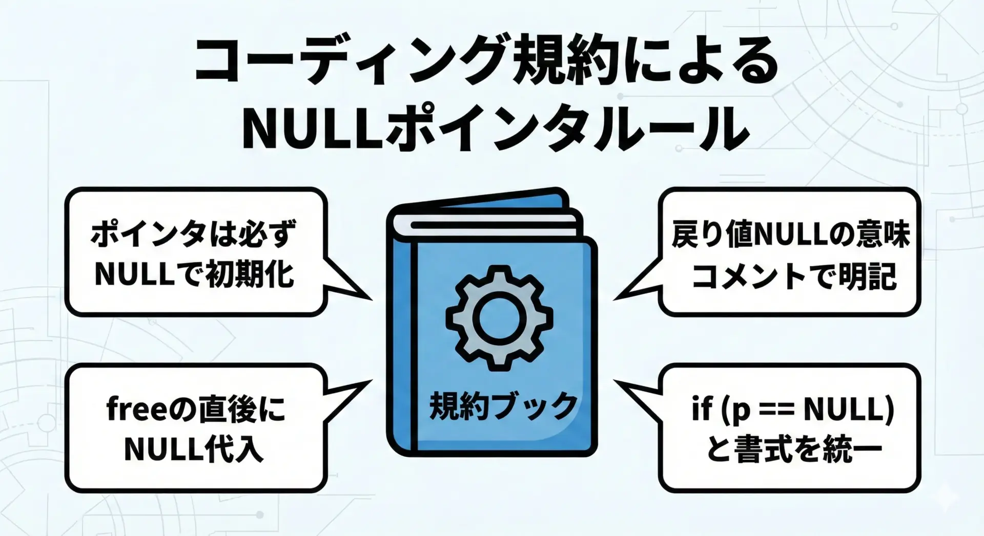 最後に、NULLポインタを安全に扱うためには、チームやプロジェクト単位でコーディング規約を決めて統一することが有効です。
