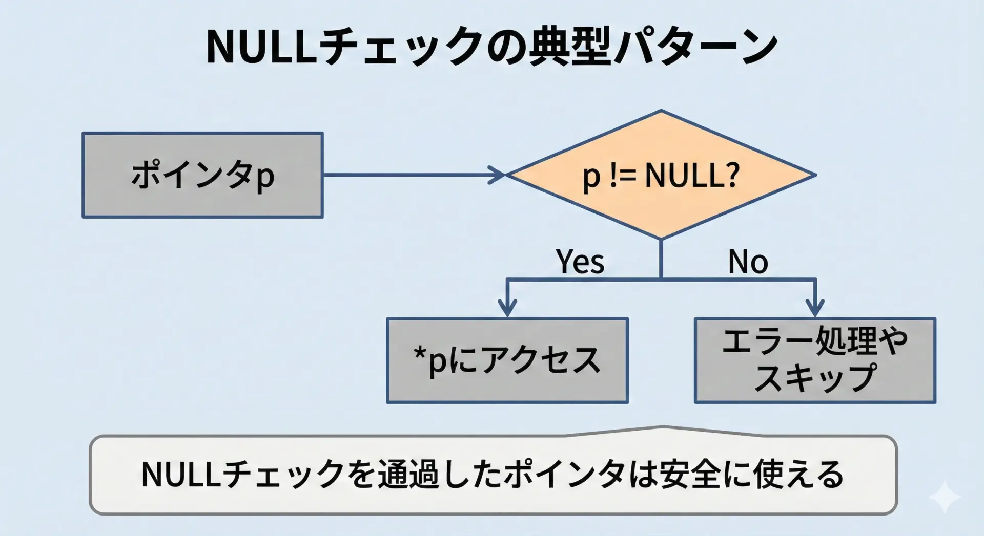 NULLポインタは、C言語において「何も指していない」状態を表す重要な概念ですが、扱いを誤るとクラッシュや未定義動作の原因になります。