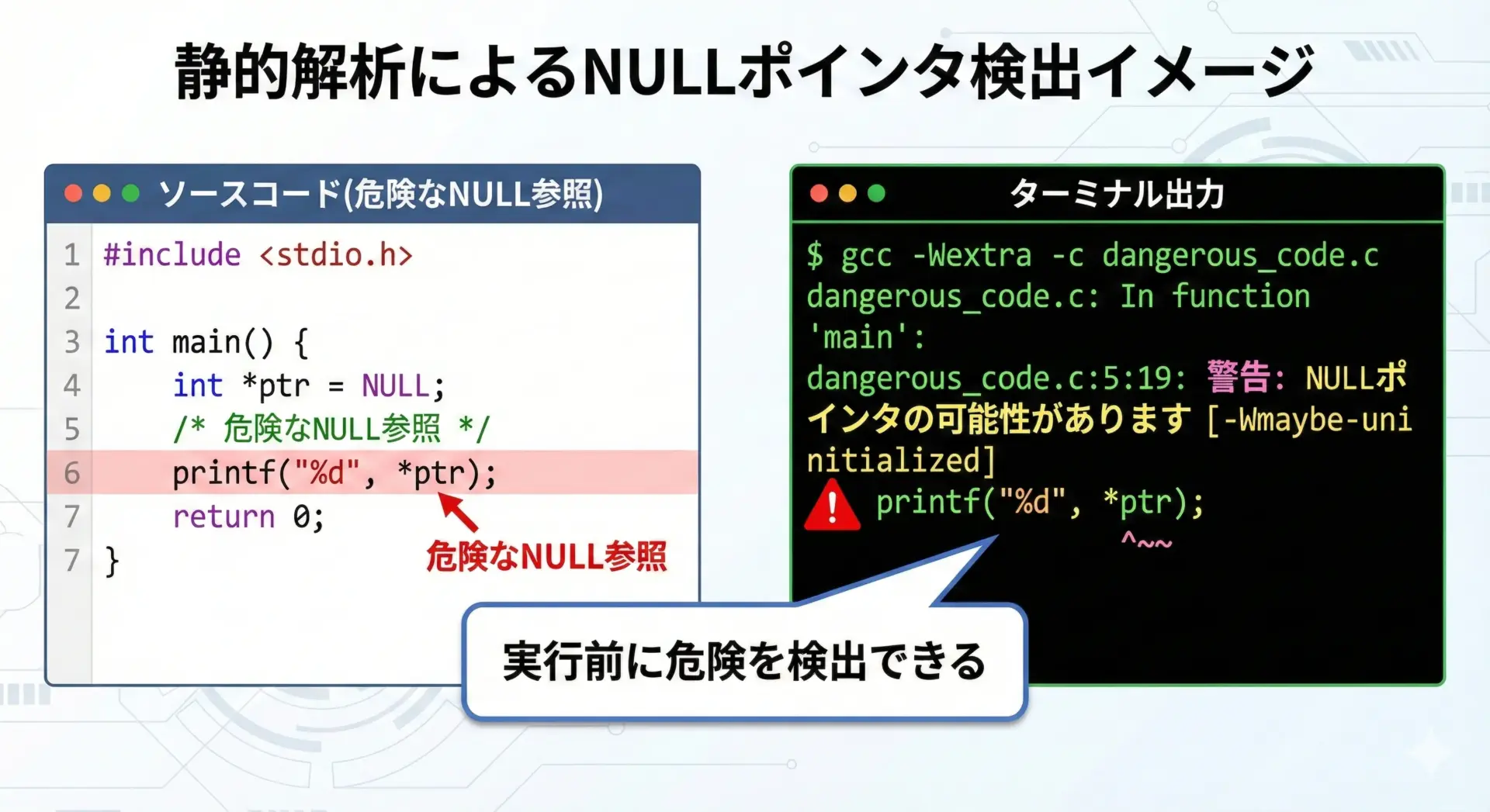 静的解析ツール(static analyzer)を使うと、コンパイル時にNULLポインタの危険な使用を検出できます。
