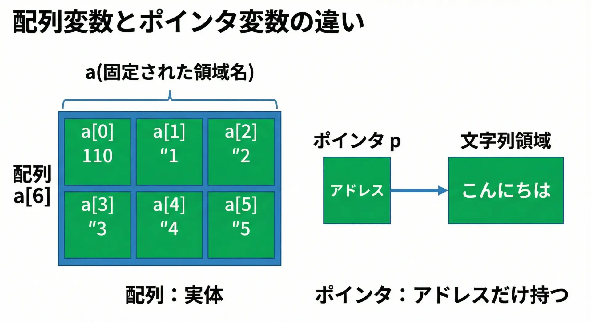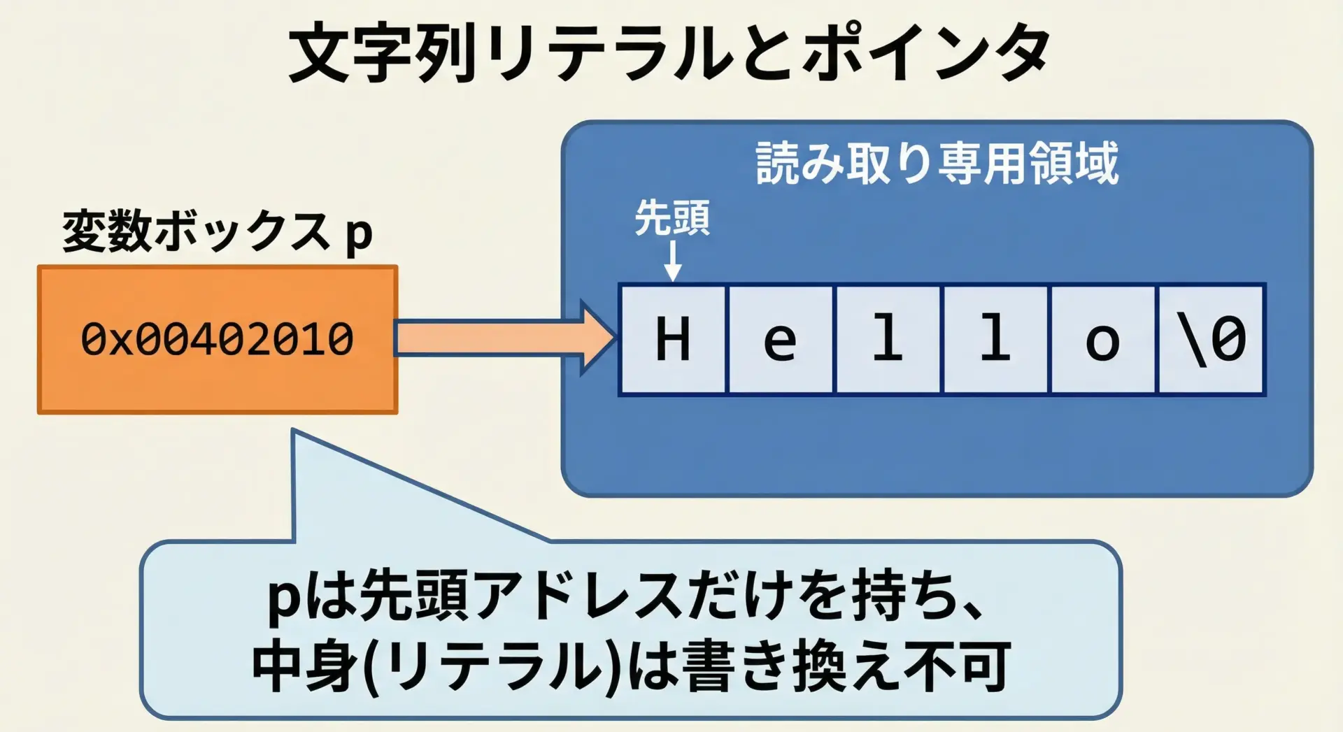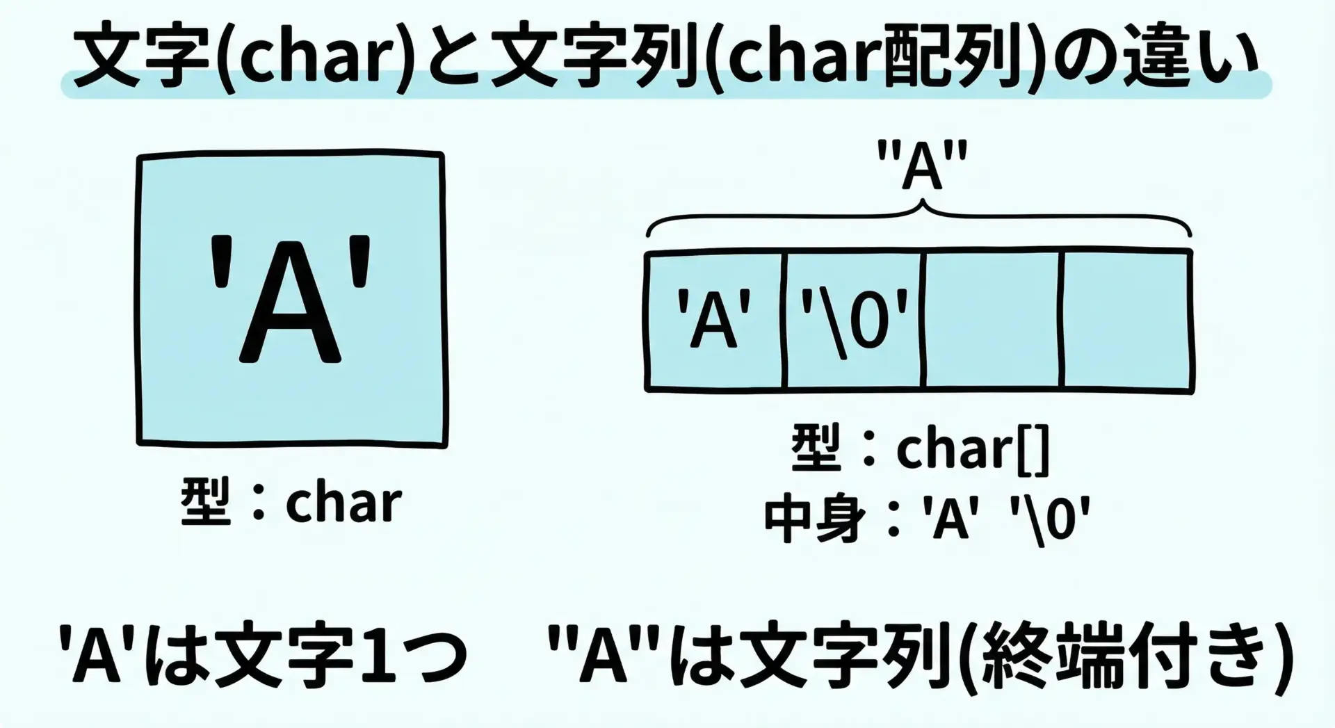 ここで「文字は1つの値」「文字列は配列(実体)か、その先頭を指すポインタ(アドレス)」というイメージを持っておくと、この後の配列・ポインタの理解がとてもスムーズになります。