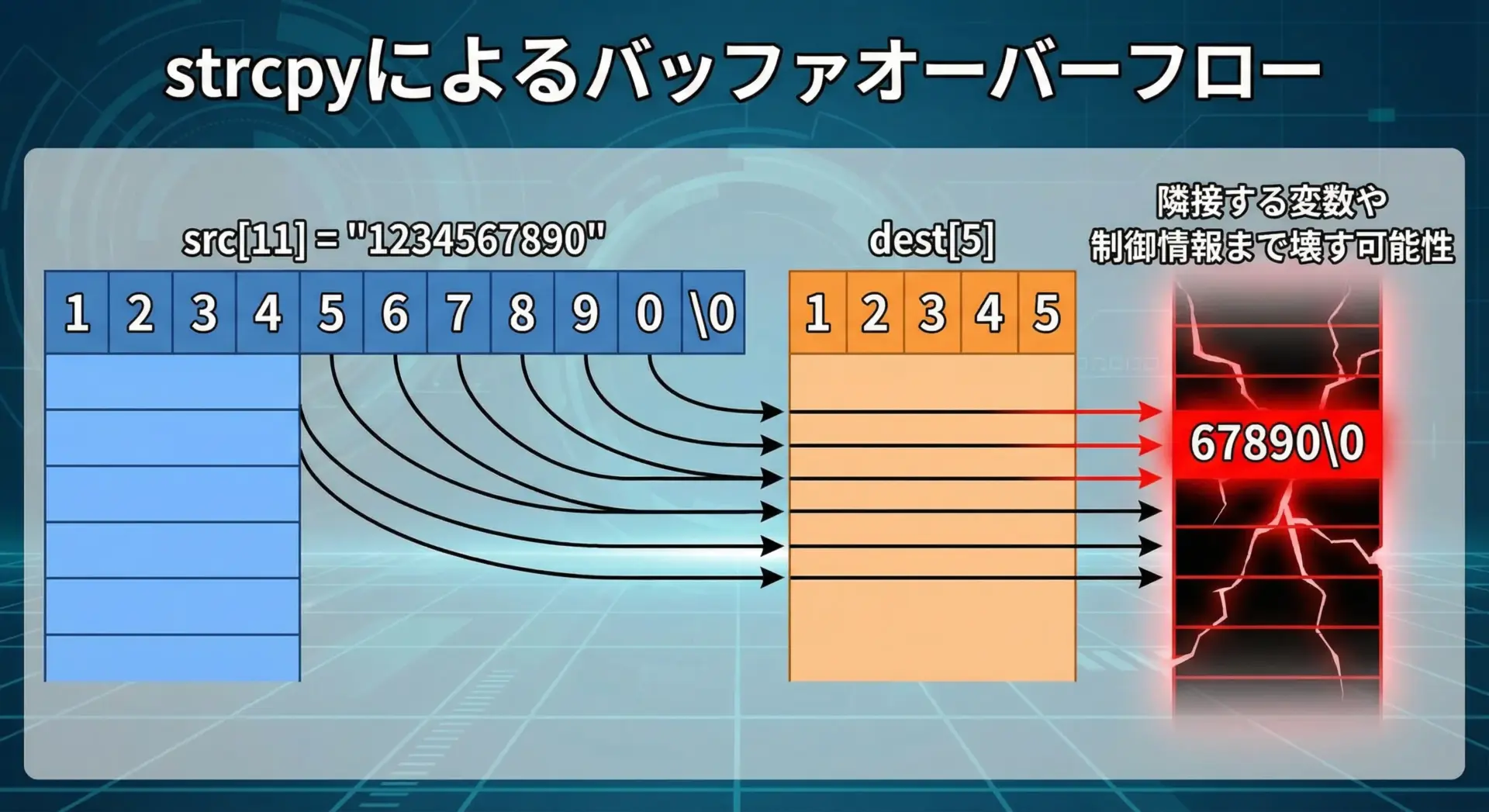 strcpy(dest, src); // バッファオーバーフロー(未定義動作)