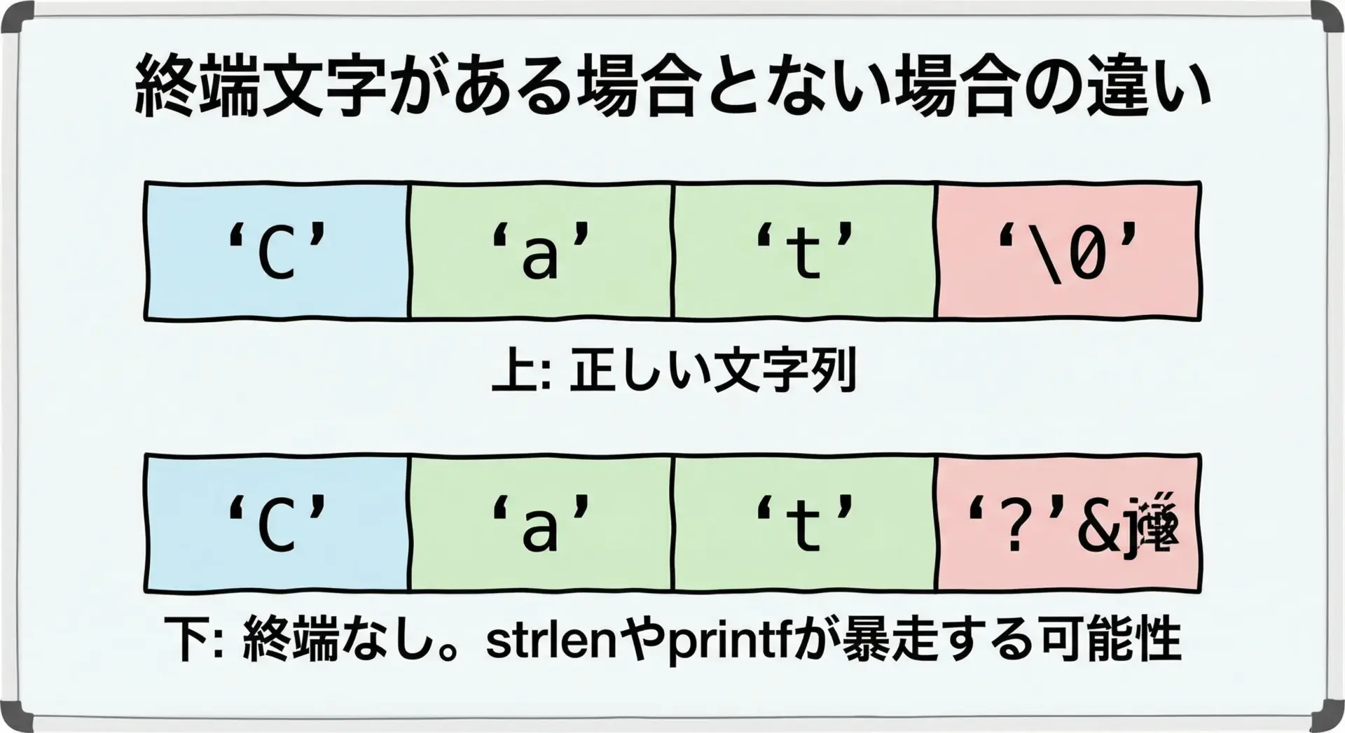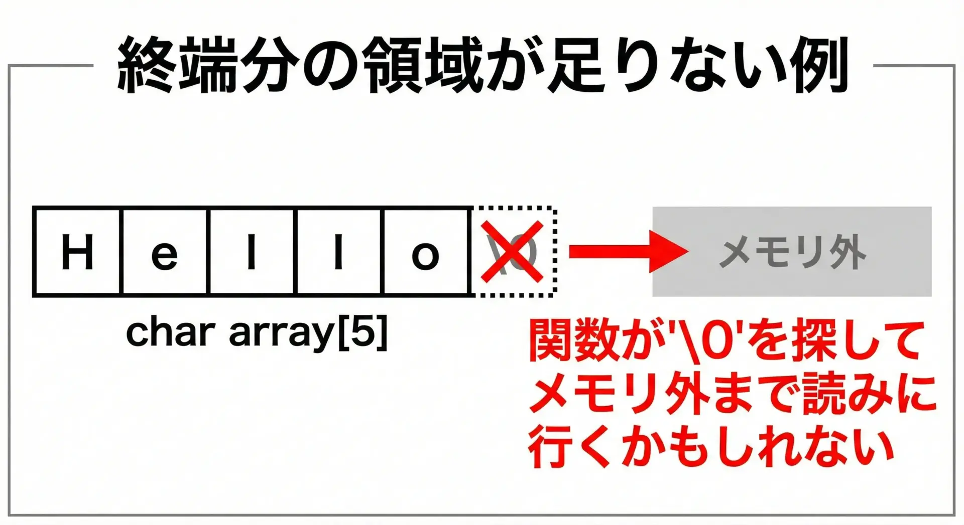 このように、終端文字がないと関数はどこまでもメモリを読み続けてしまい、未定義動作を引き起こします。