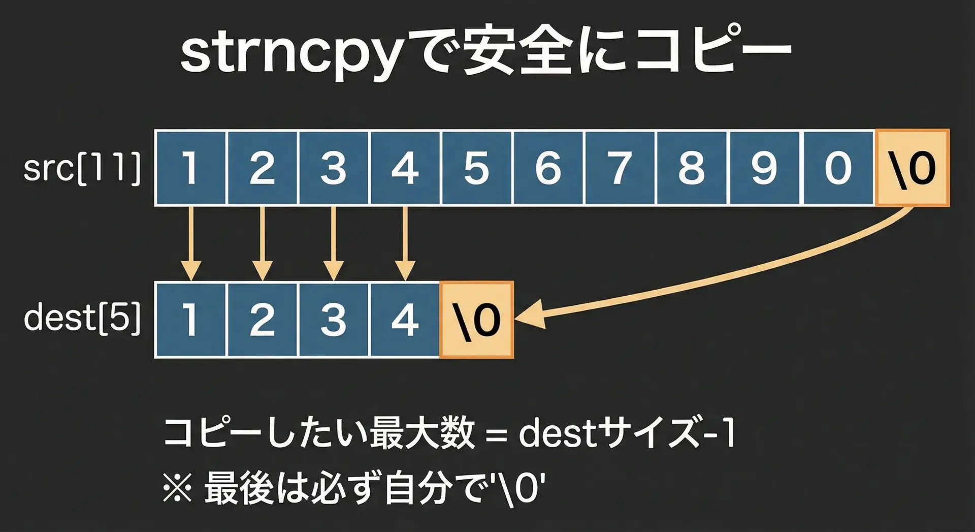 strncpyのように、自動で終端を付けてくれない関数もあるため、コピー後にdest[サイズ-1] = '\0';と書く癖を付けると安全です。
