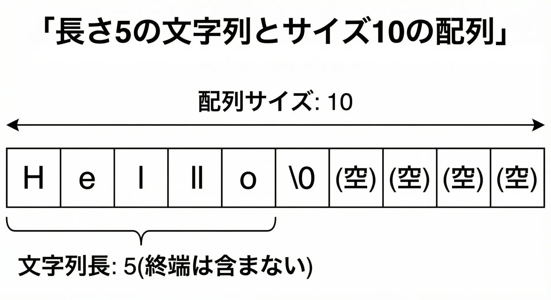 用意したサイズ分だけ文字を入れられます。 - 文字列の長さは「実際に入っている文字の数」