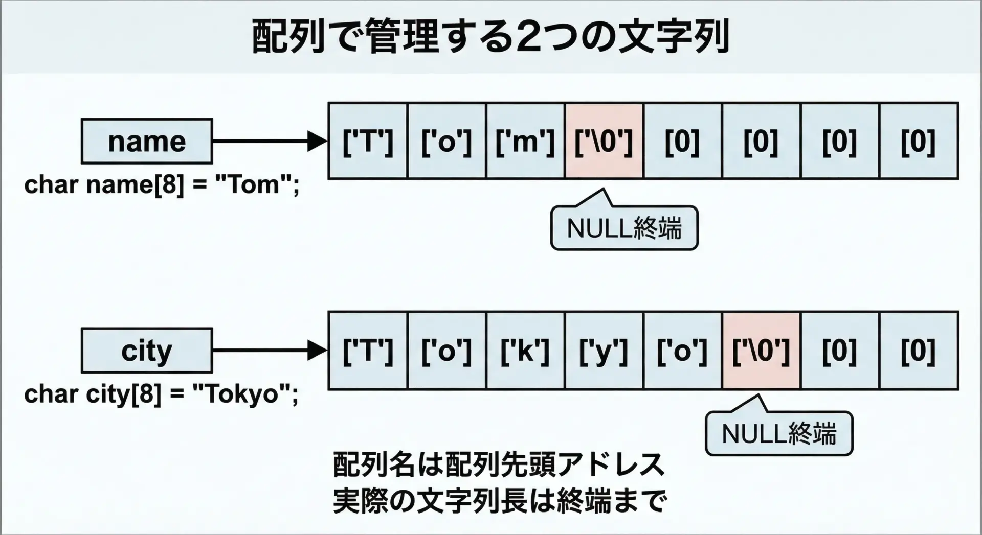 このように、char配列で文字列を扱う場合は、次のように意識すると分かりやすくなります。