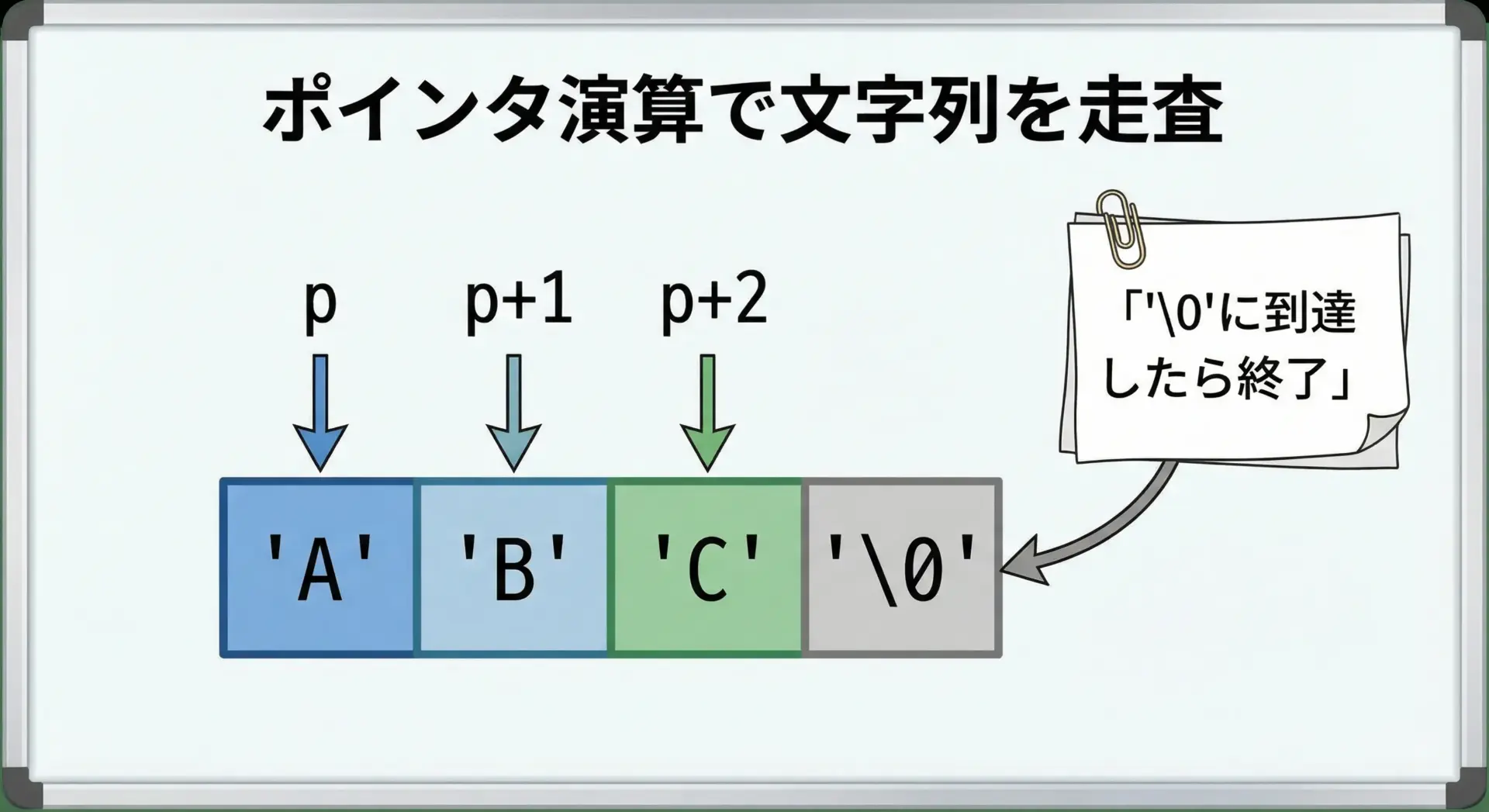 C言語の文字列は、「char配列」「ポインタ」「終端文字'\0'」の3つが組み合わさった仕組みです。