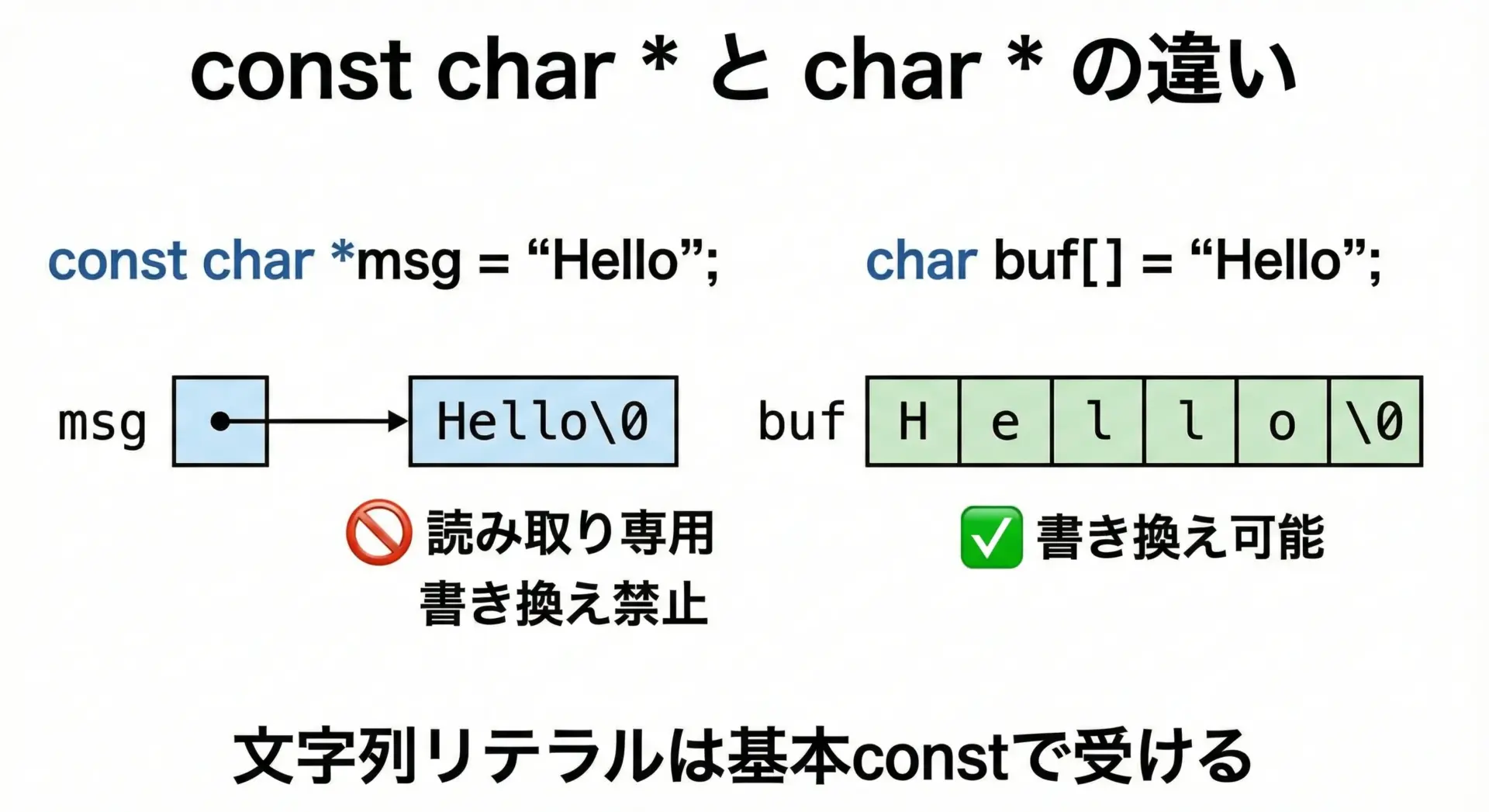 さらに、文字列リテラルは常にconst char *で受けるように統一しておくと、書き換え禁止であることが型から分かるため、誤って壊してしまうリスクを減らせます。