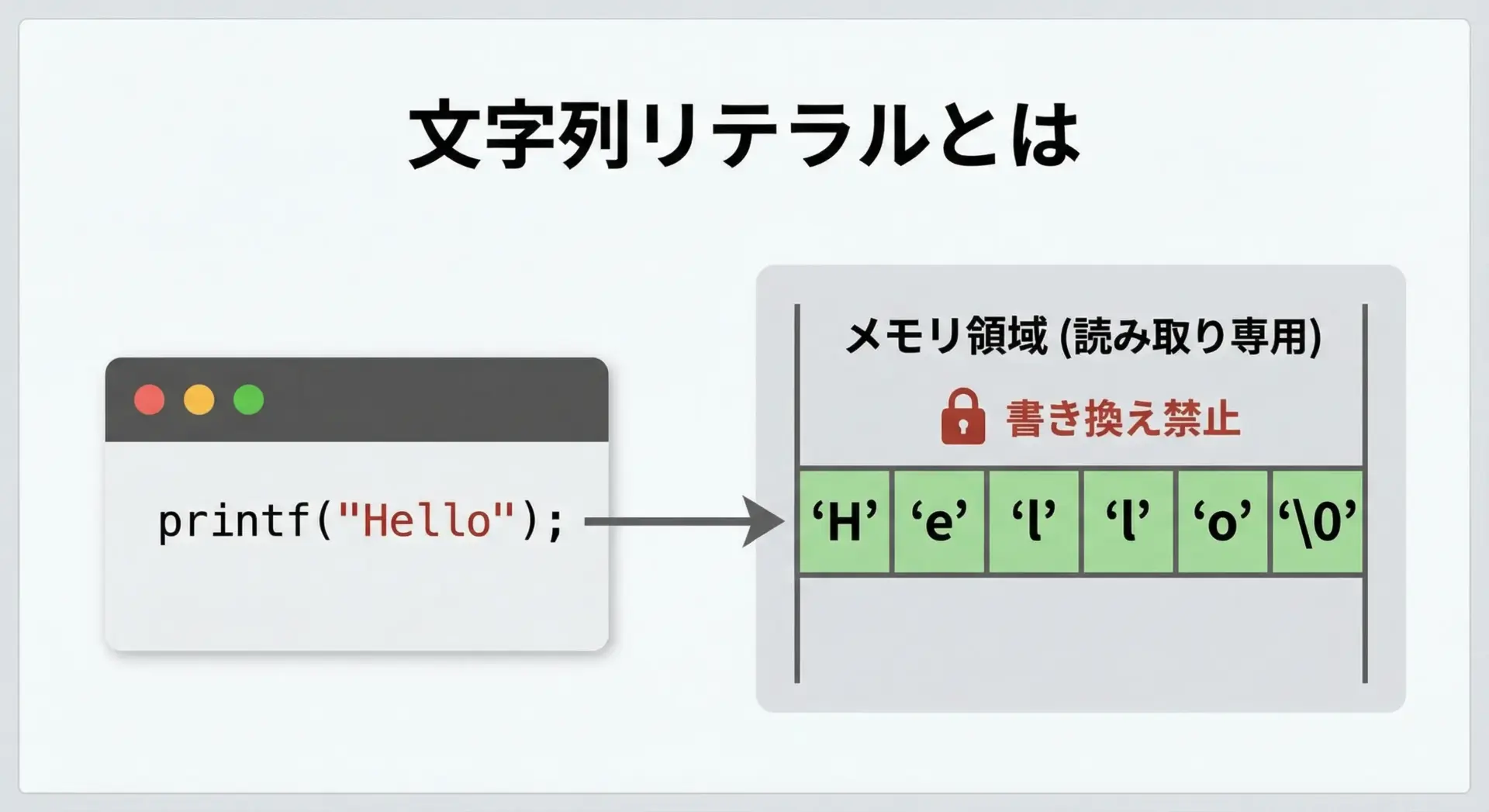 このとき"Hello\n"は文字列リテラルであり、コンパイルされたプログラムの中に「定数データ」として埋め込まれます。