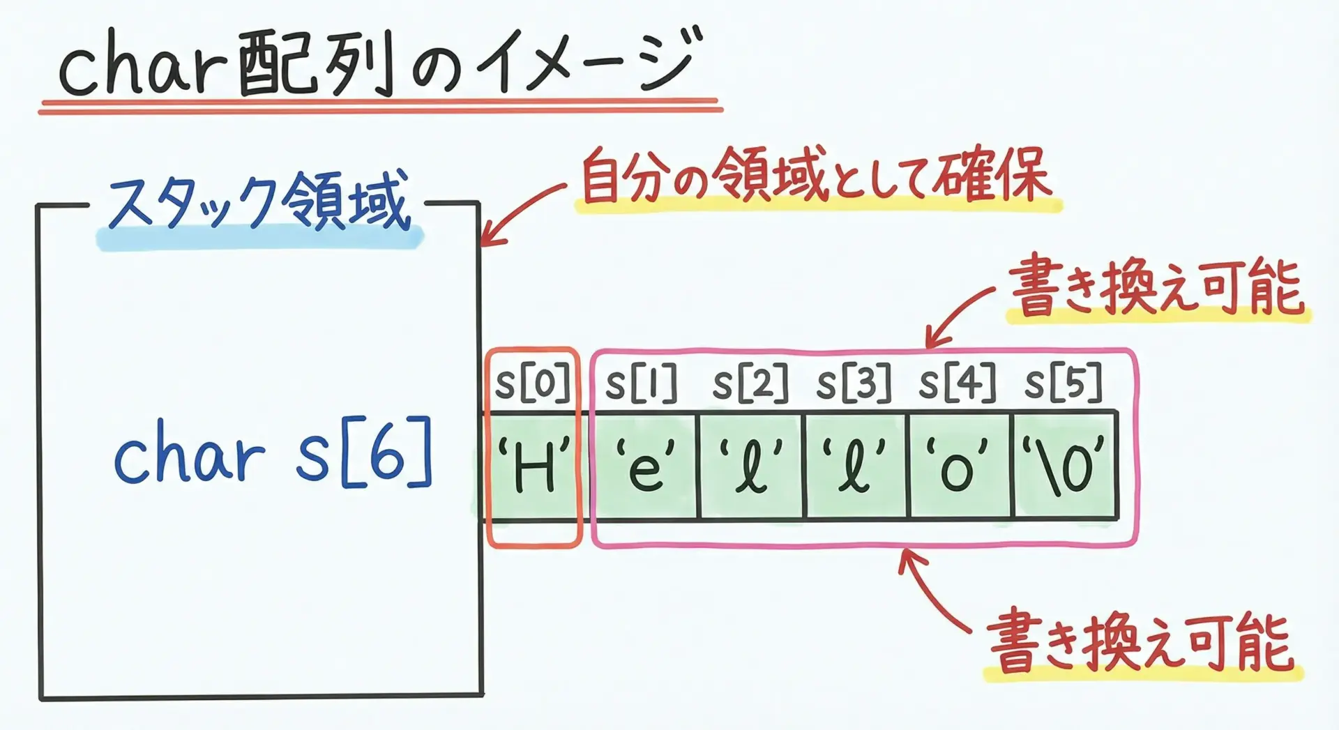 一方でchar配列は、スタックなどに確保され、スコープ内でのみ有効で、自由に書き換え可能です。
