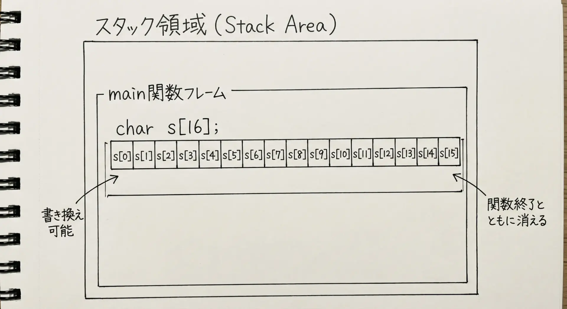 一方、char配列は定義の仕方によってメモリ領域が変わりますが、もっとも典型的なのはローカル変数として定義されるケースです。