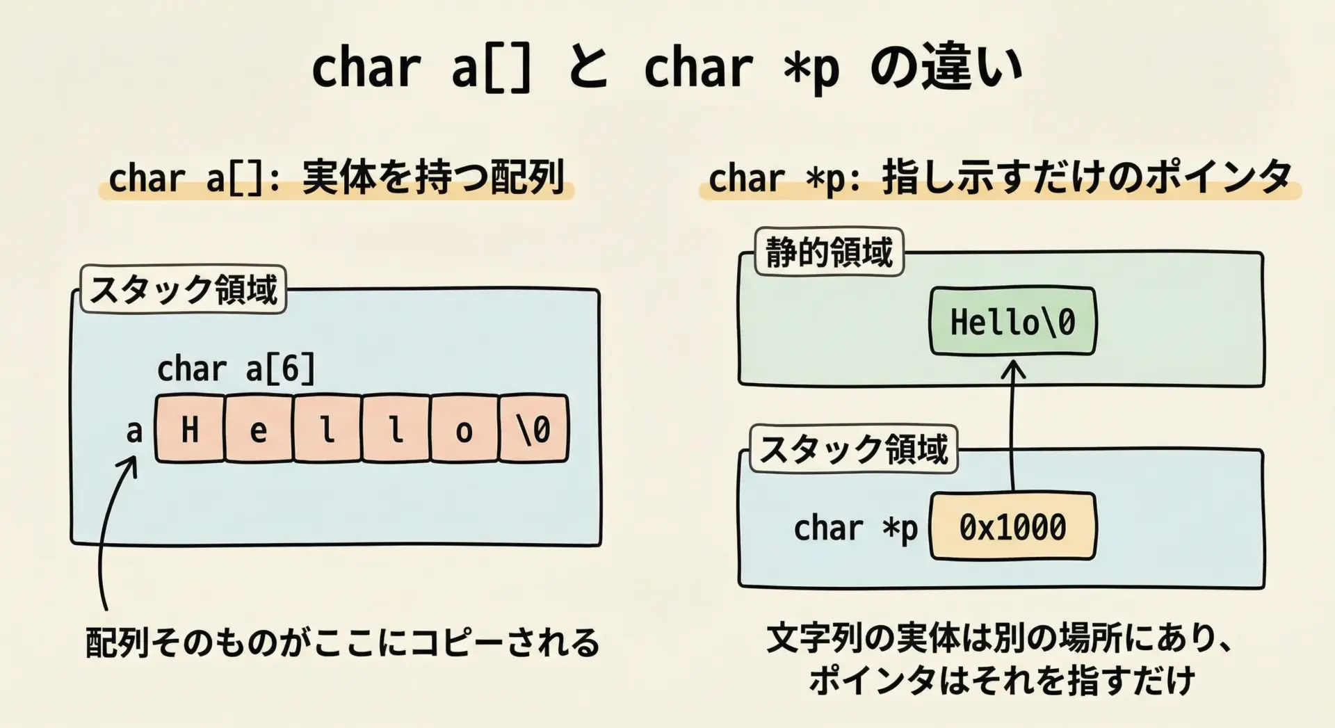 文字列リテラルとchar配列は、どちらも文字列を扱うために使われますが、「定数データ」か「自分の領域を持つ変数」かという決定的な違いがあります。