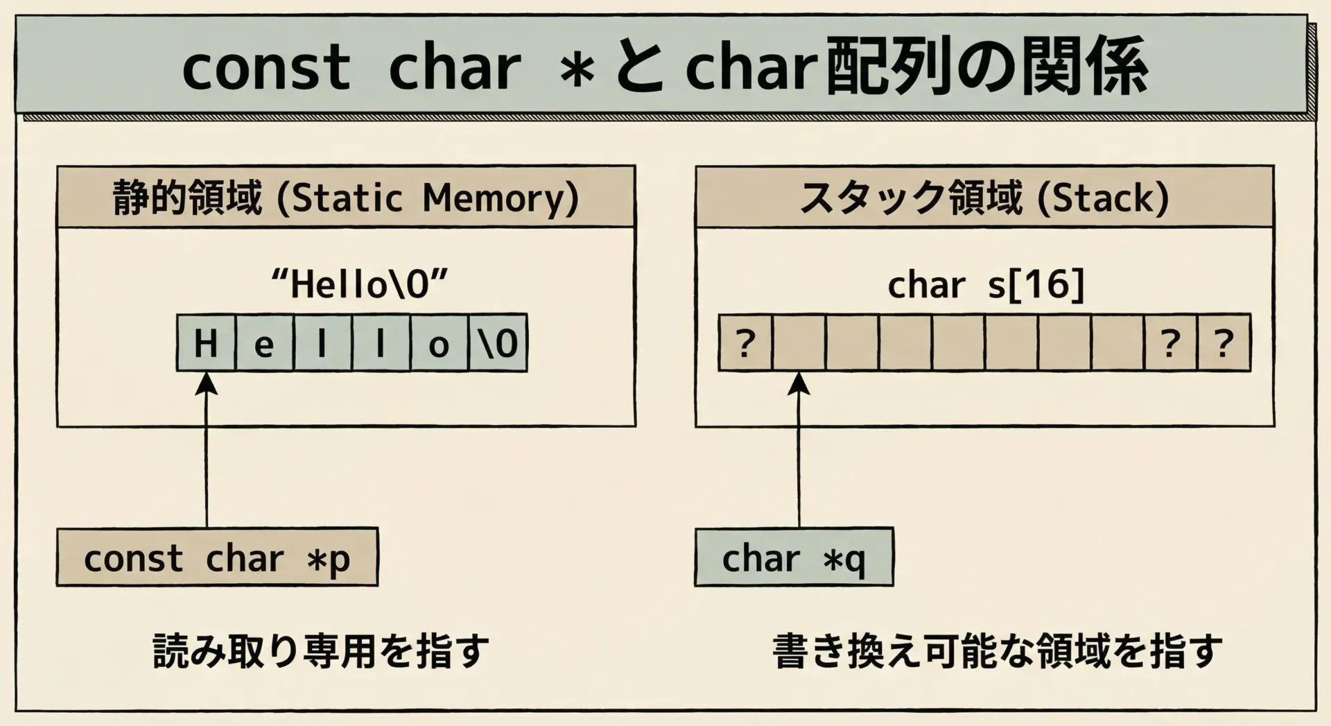 文字列リテラルとchar配列の違いを本当に理解するには、メモリ上の配置と有効期間(寿命)をセットで考える必要があります。