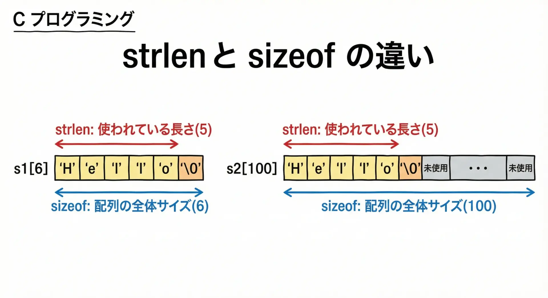 「文字列の長さが知りたいなら strlen」「領域の大きさが知りたいなら sizeof」と覚えておくとよいです。