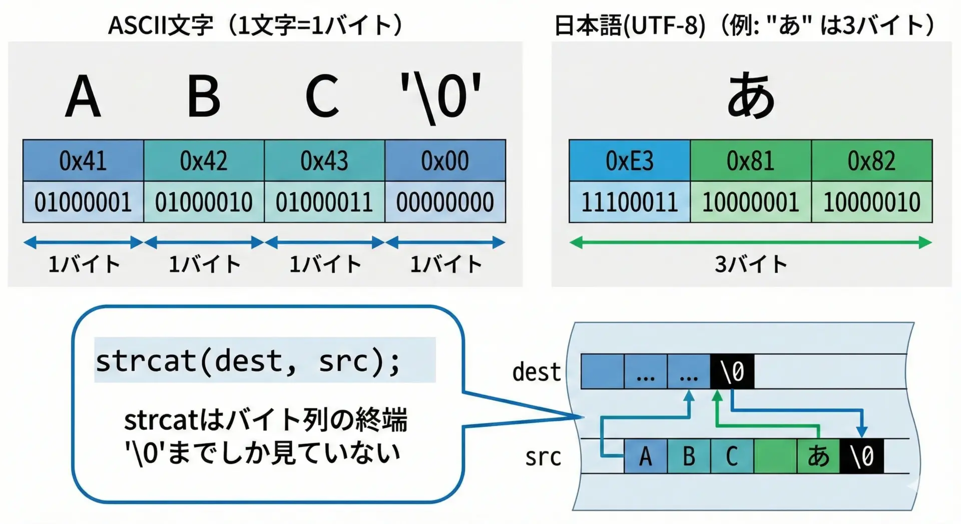 1. strcatは'\0'が出てくるまでバイトをコピーするだけであり、文字コードの中身は一切理解していません。