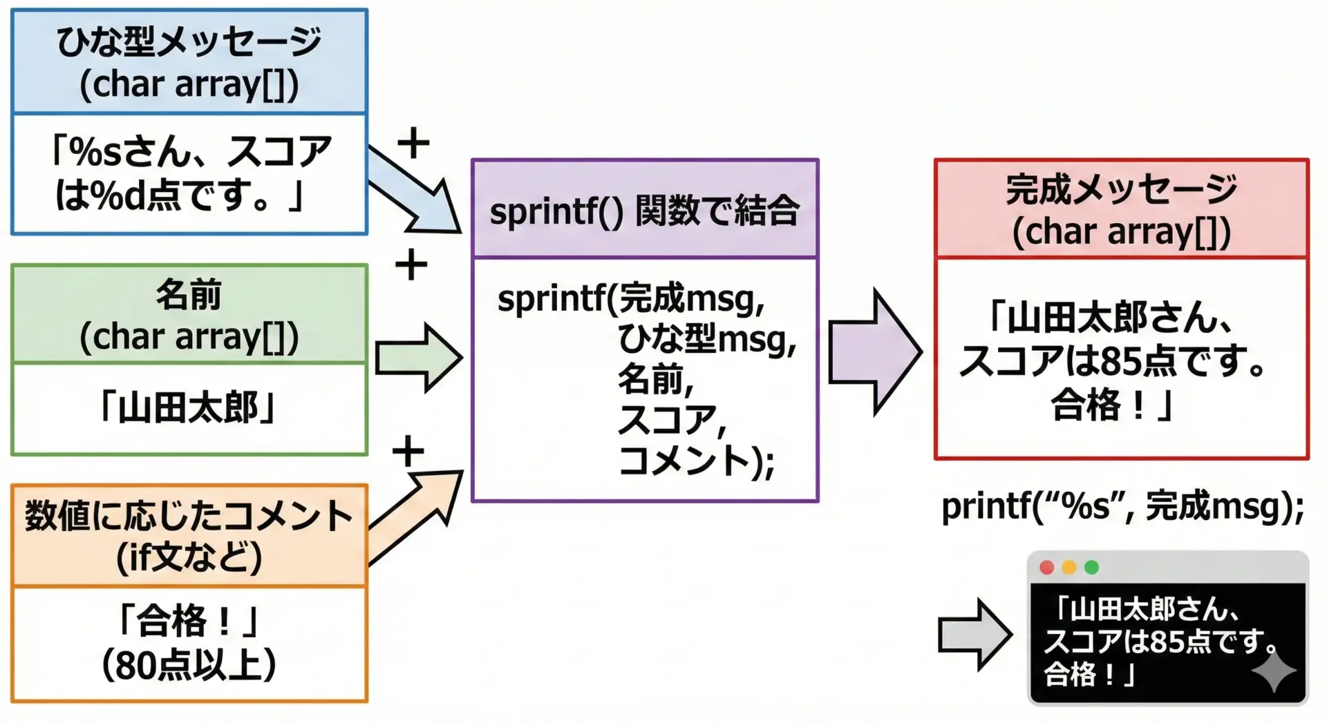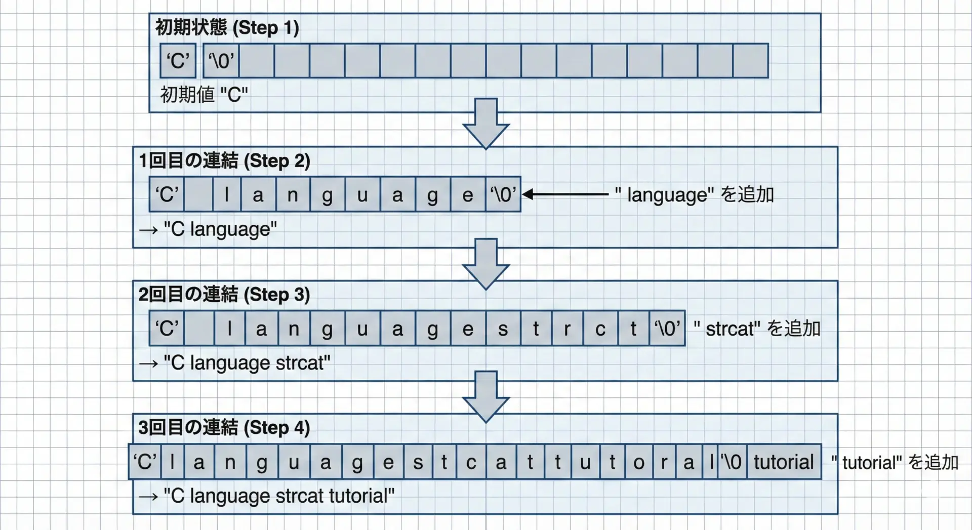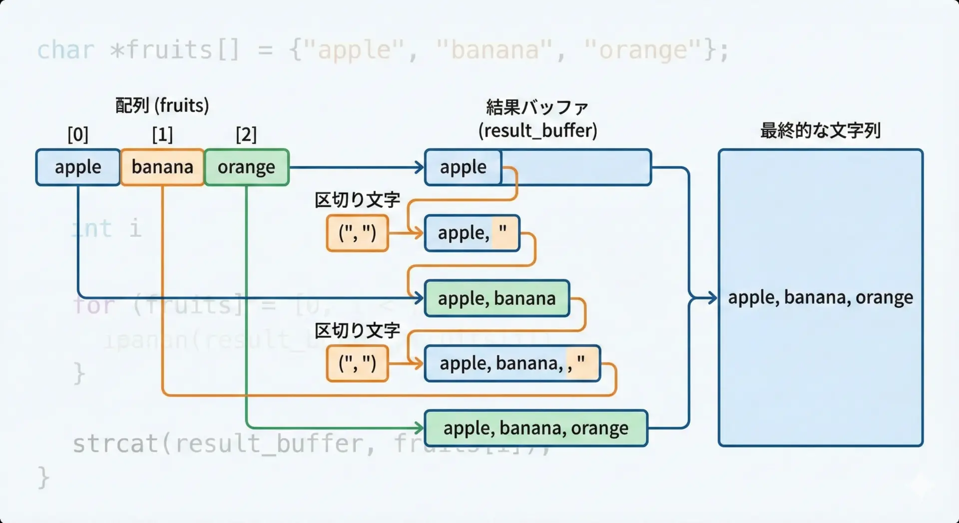 このように、strcatは「リストや配列の内容を1つの文字列にまとめる」処理とも相性が良い関数です。