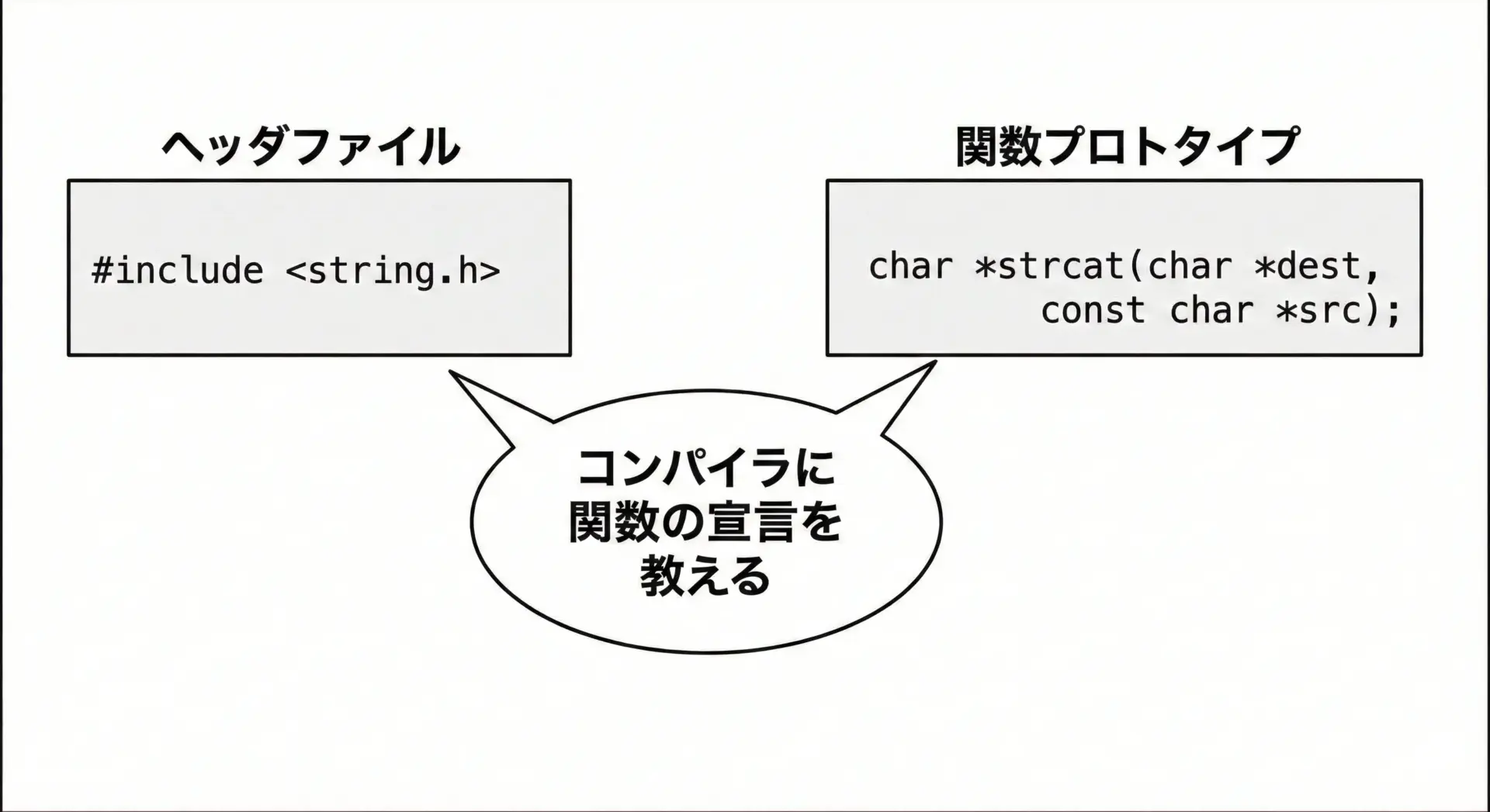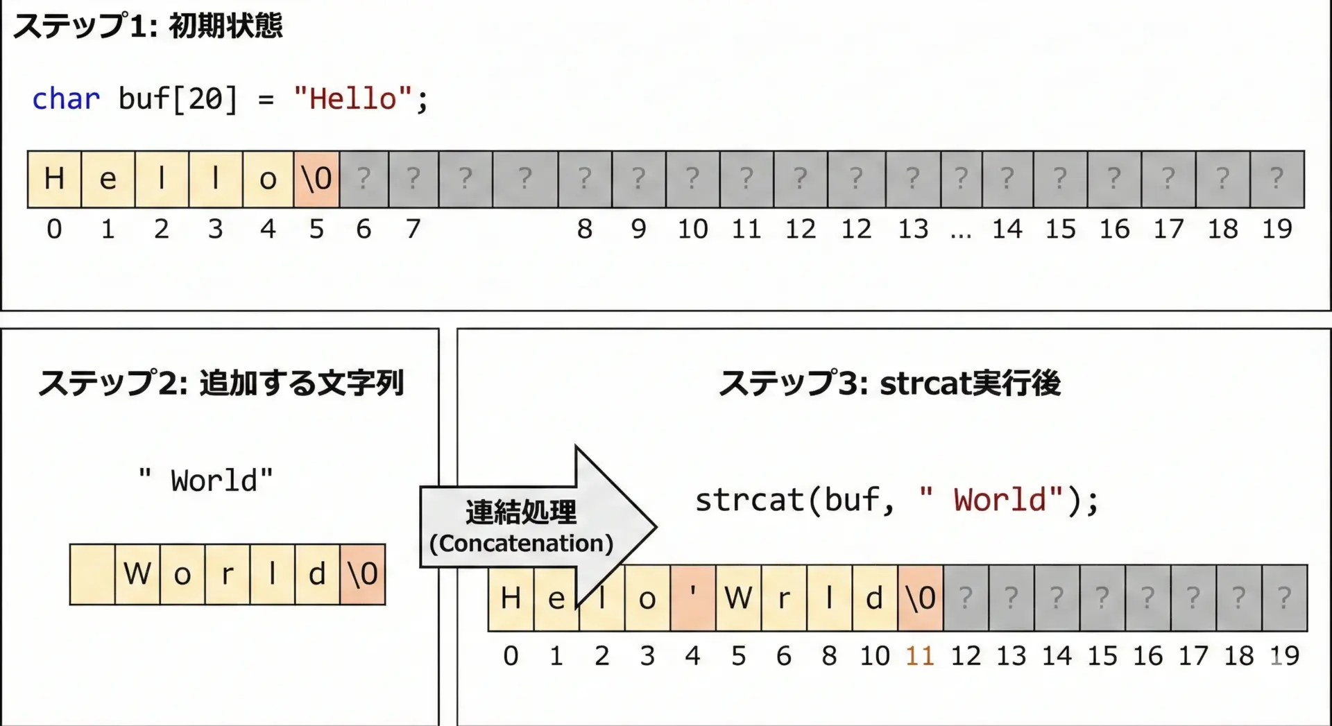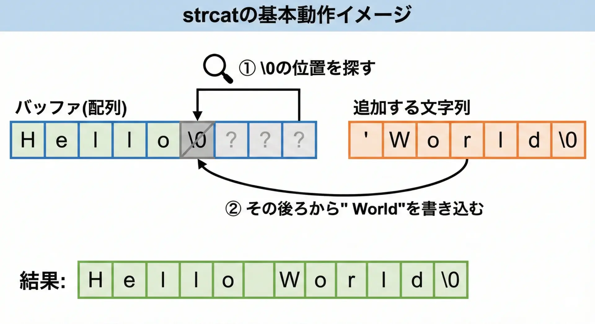 strcatは、C言語で文字列を末尾に連結するための基本的な関数です。