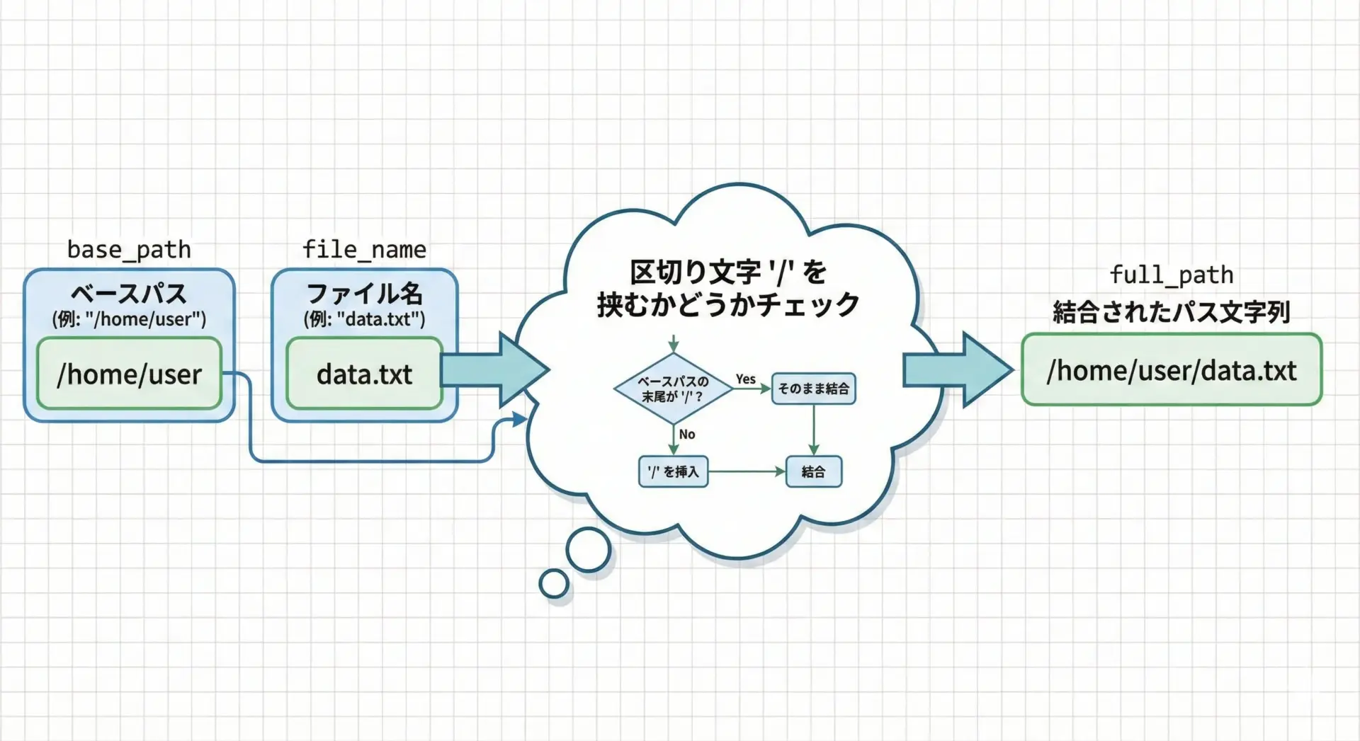 例えば、「ベースディレクトリ」と「ファイル名」を連結してフルパスを作るような処理です。