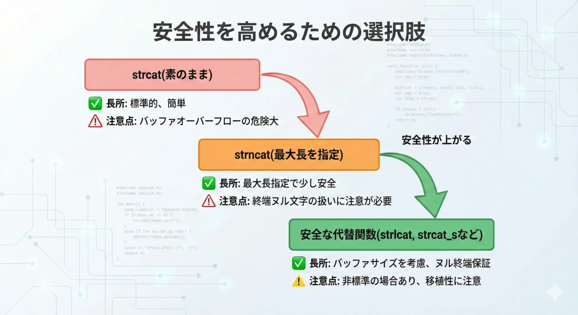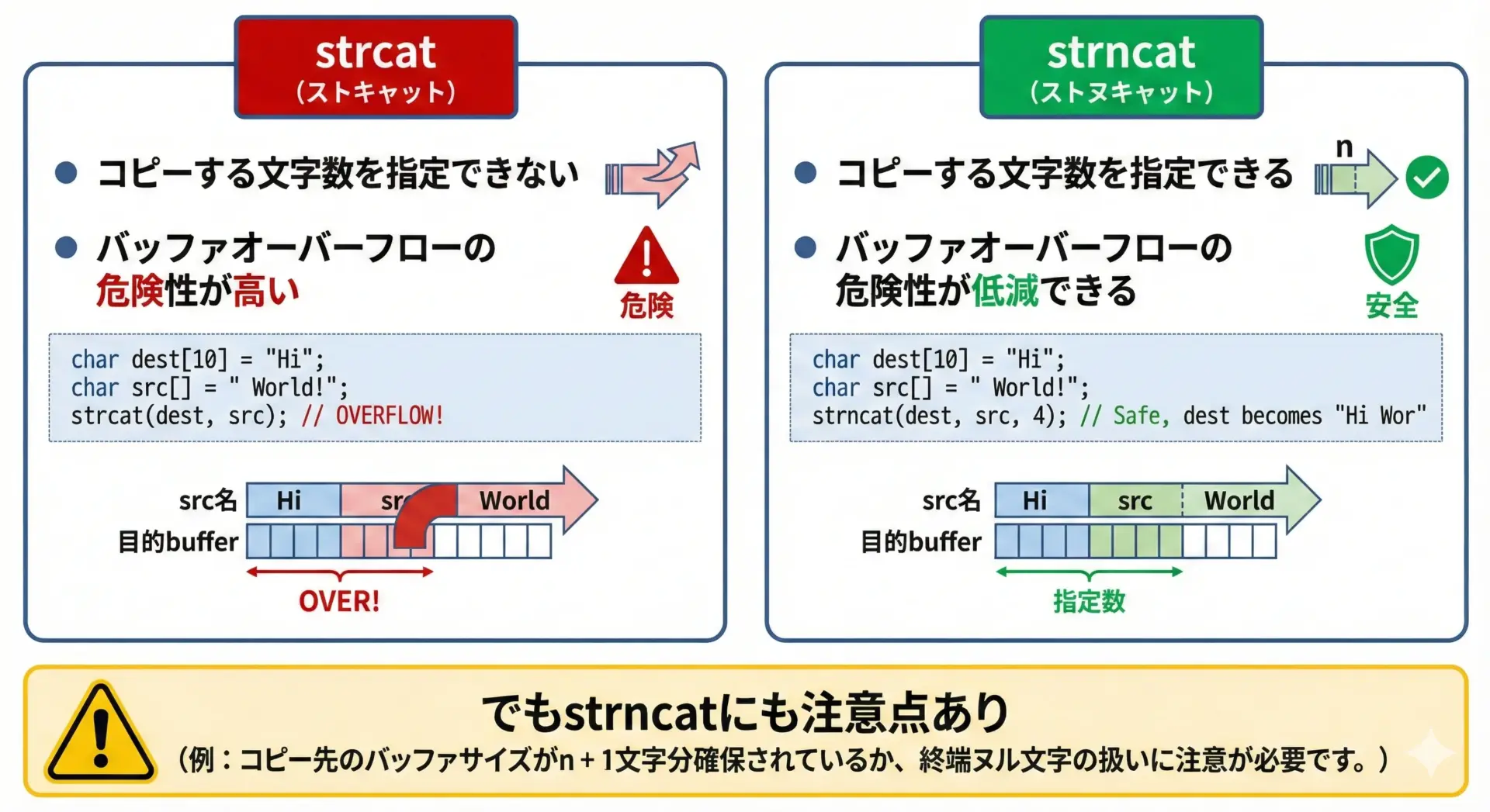 実務的には、strncatや環境が提供する安全な代替関数と組み合わせたり、事前にstrlensizeofでサイズを確認したうえで使うことが重要です。