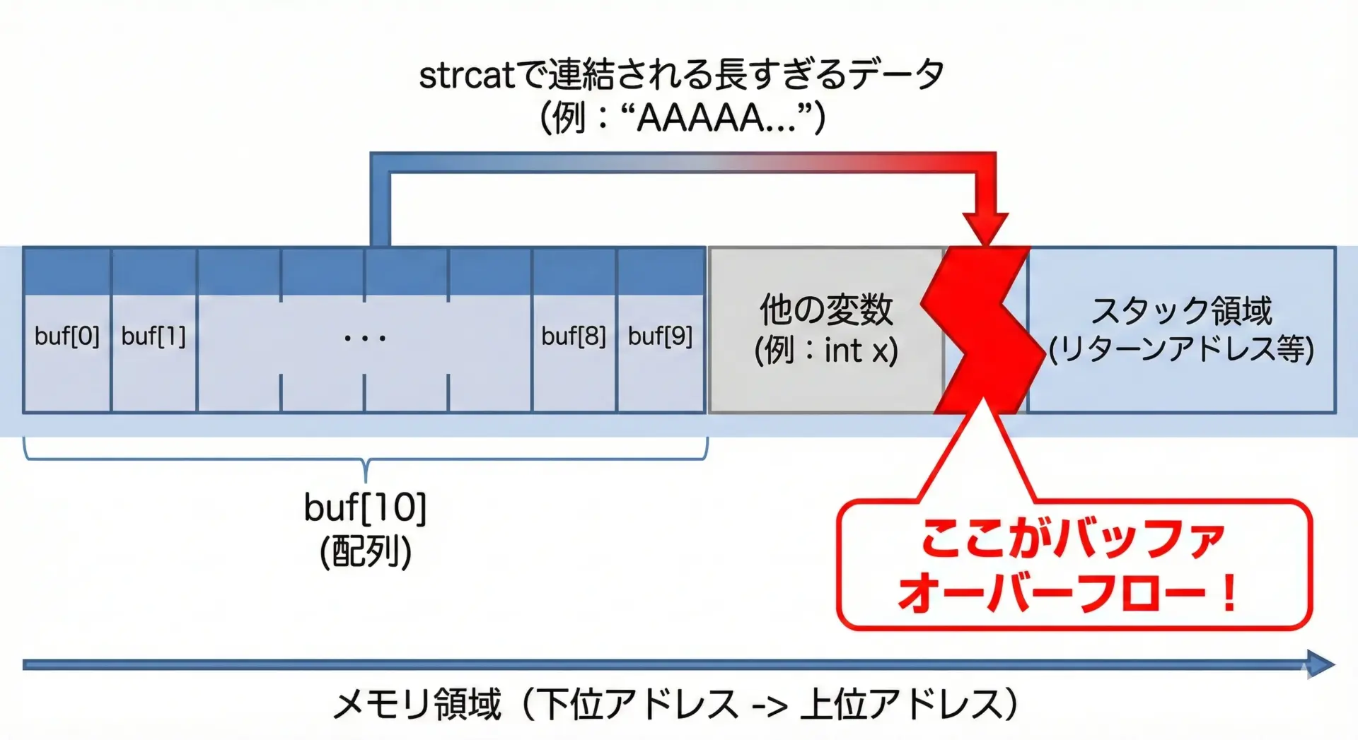 後ほど詳しく触れますが、ここを考えずにstrcatを使うとバッファオーバーフローの原因になります。