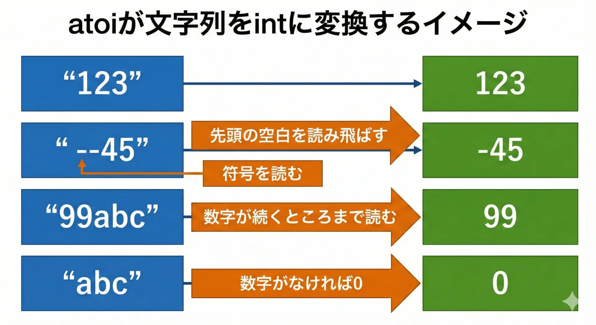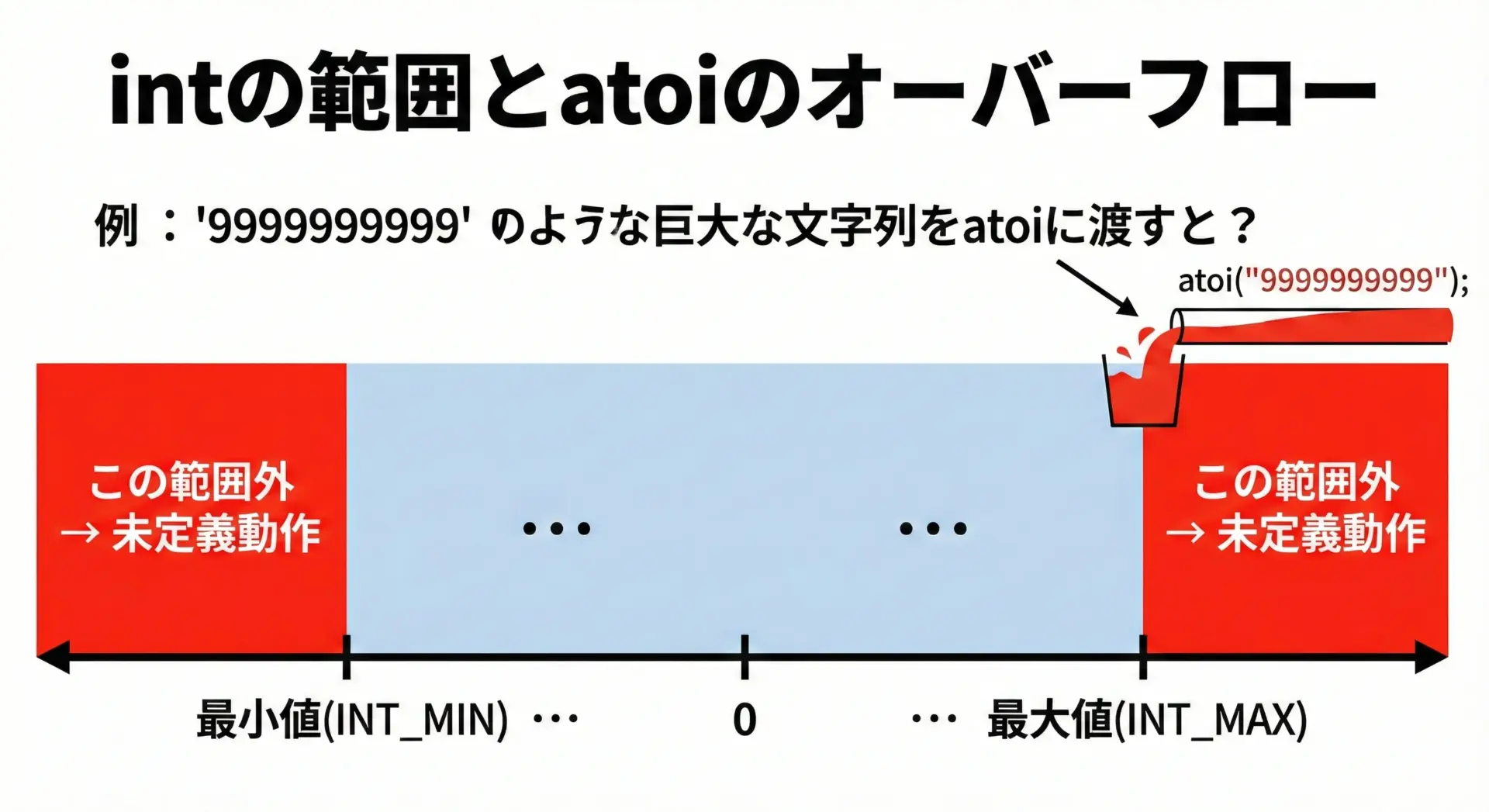 atoiは「文字列をintに変換する」ための、シンプルで歴史ある関数ですが、エラー検出ができず、オーバーフローも未定義動作という大きな欠点があります。