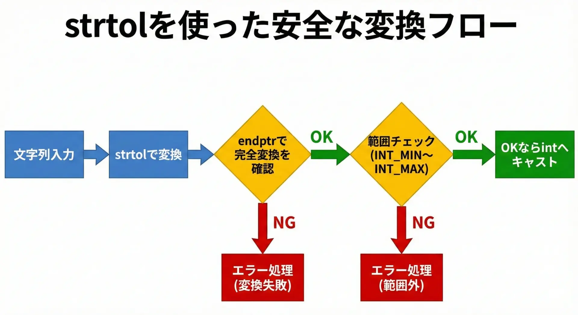 これらを洗い出し、状況に応じてstrtolstrtoulなど適切な関数を選ぶことが大切です。