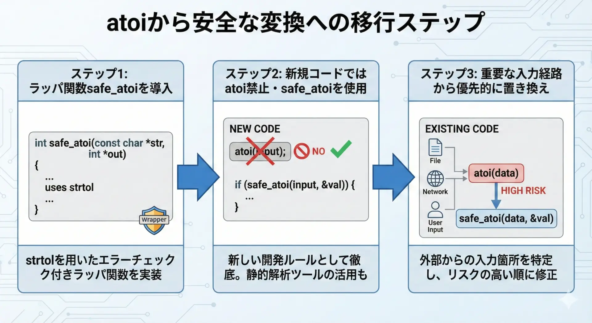 プロジェクト内のコーディング規約として、「新規コードではatoiを使用しない」ことを明記し、コードレビューや静的解析ツールでのチェック対象にすると、長期的な品質向上につながります。