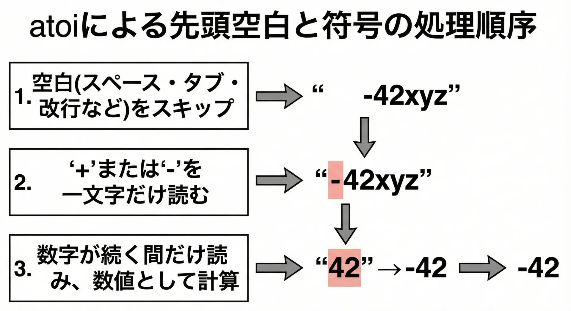 ここから分かるように、atoiは「先頭の空白を無視しつつ、符号と数字部分だけを読む」動作をします。