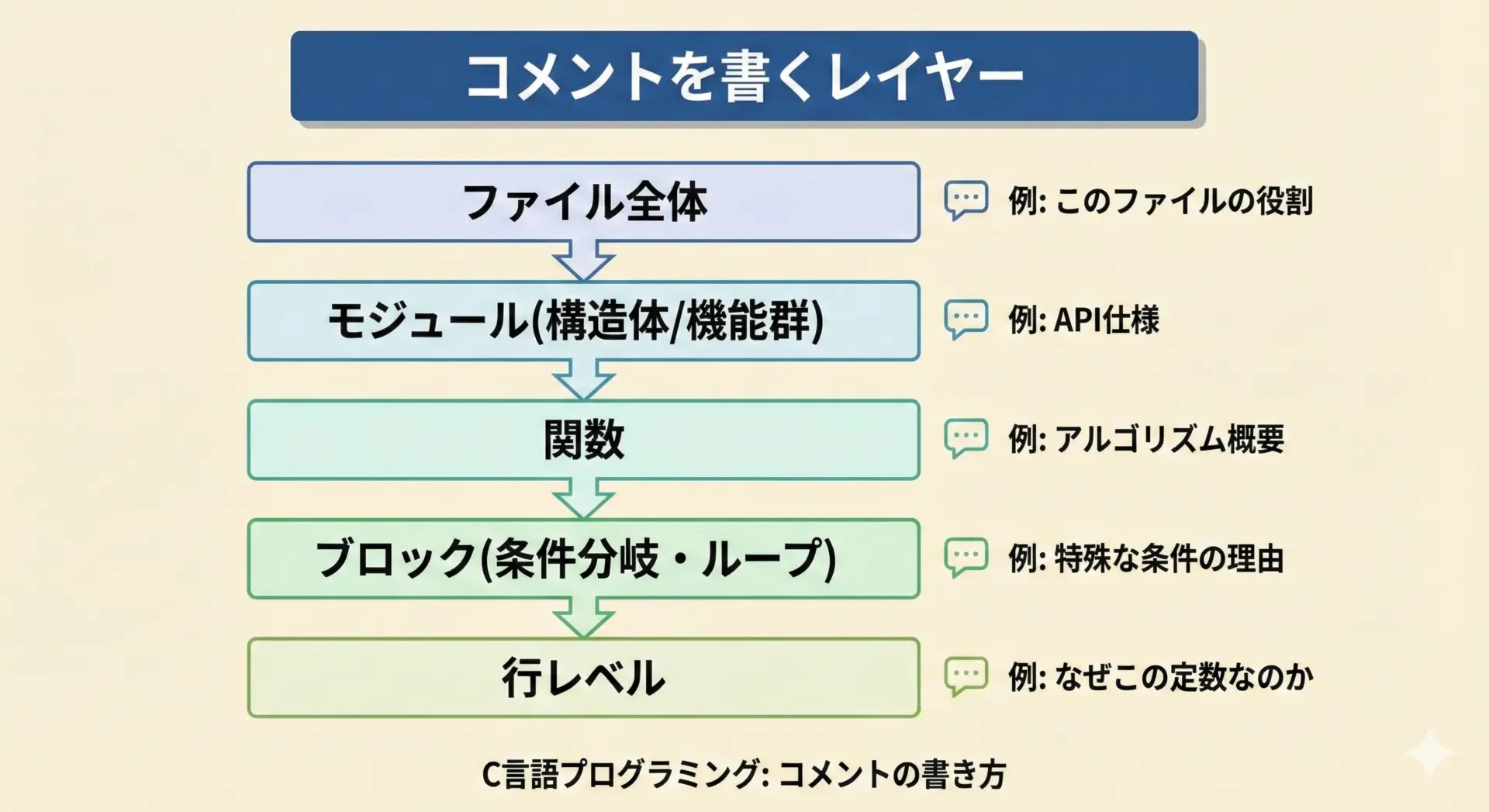 どの範囲に何を書くかを意識し、コードからは読み取れない「意図」「背景」「制約」「設計方針」を中心にコメントすることで、保守性と信頼性が大きく向上します。
