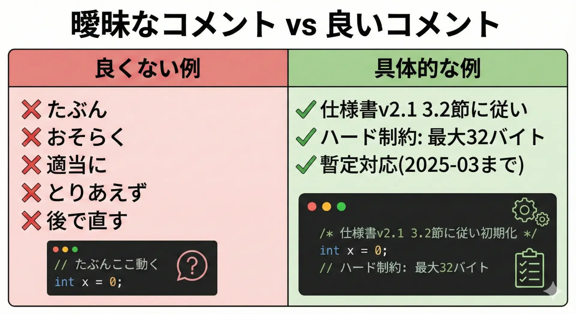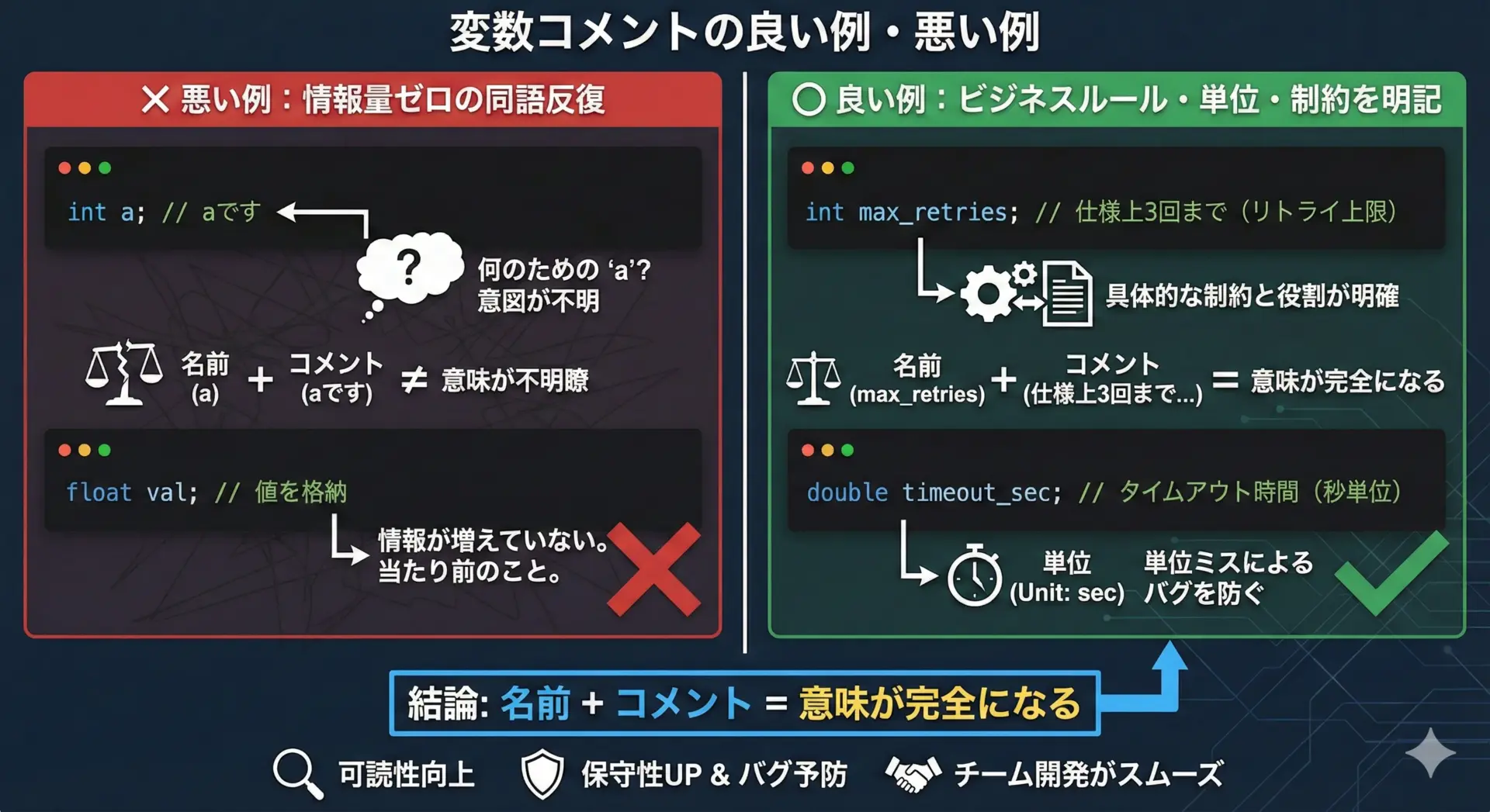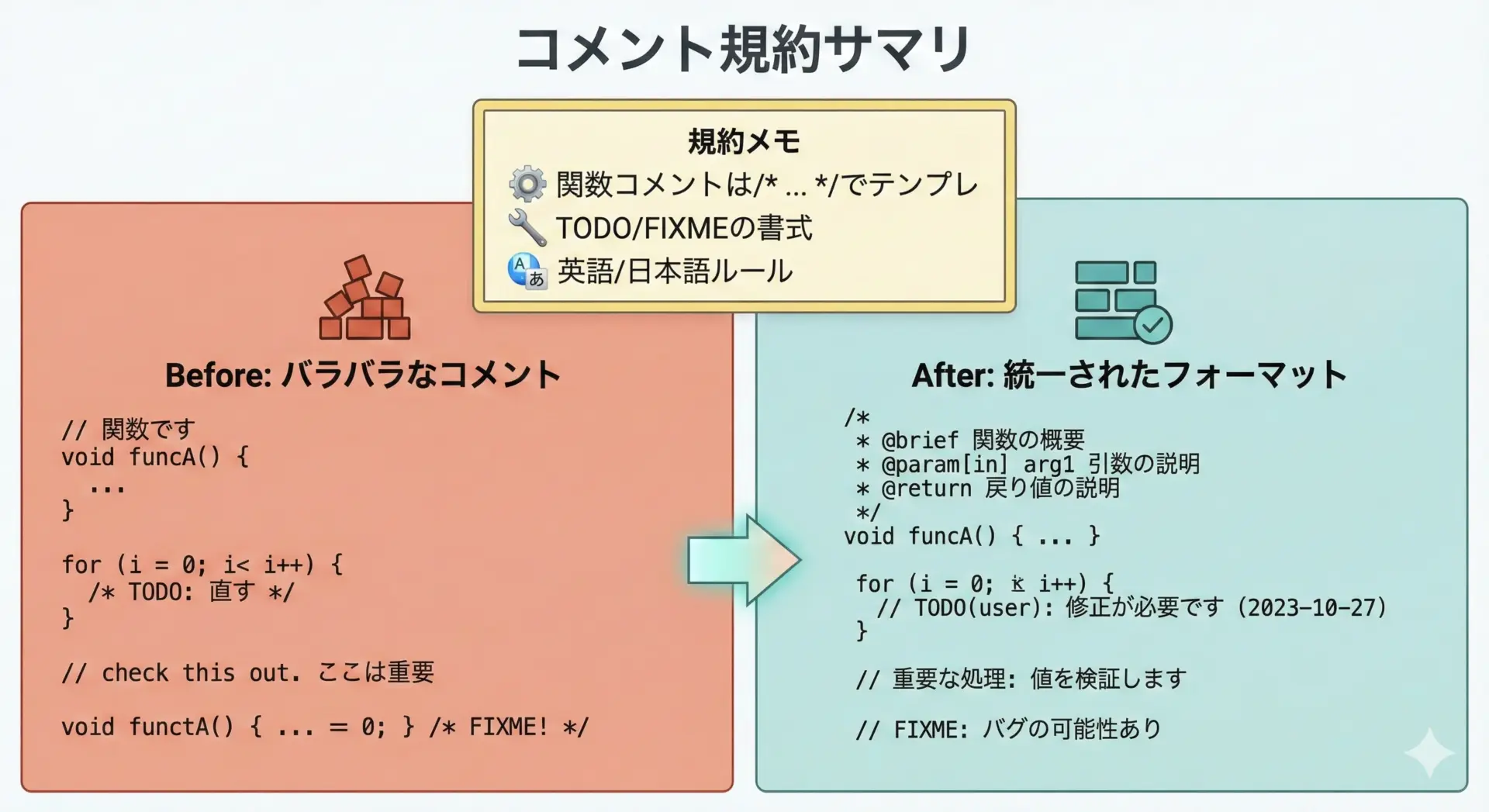 NG例で見たような「嘘のコメント」「冗長すぎるコメント」を避けつつ、チームで統一したルールを運用すれば、コメントは強力な開発支援ツールになります。