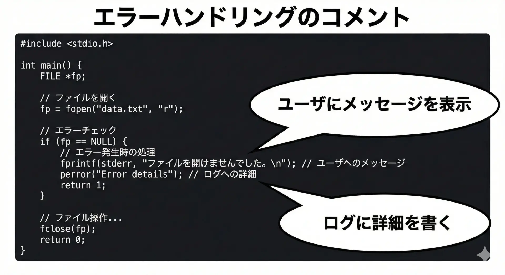 エラーハンドリングは、「なぜこのように扱うのか」をコメントしておくと、意図が伝わりやすくなります。