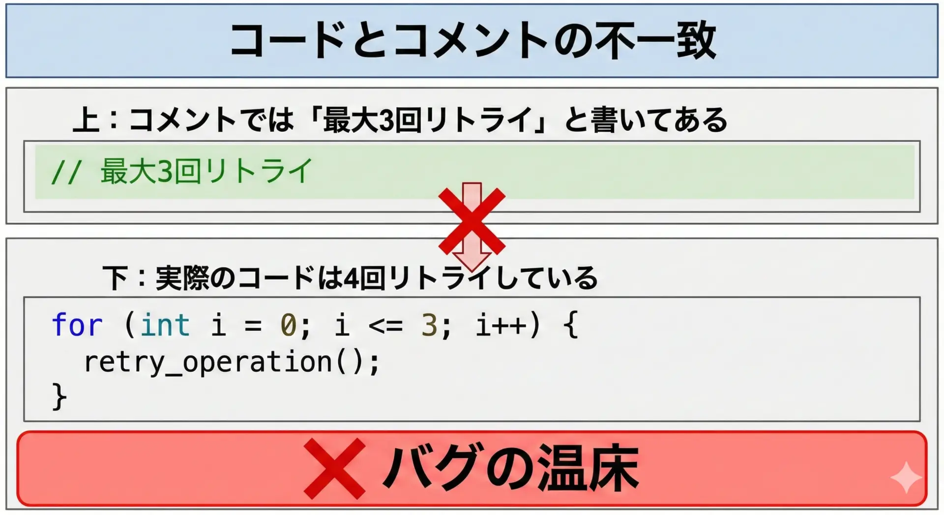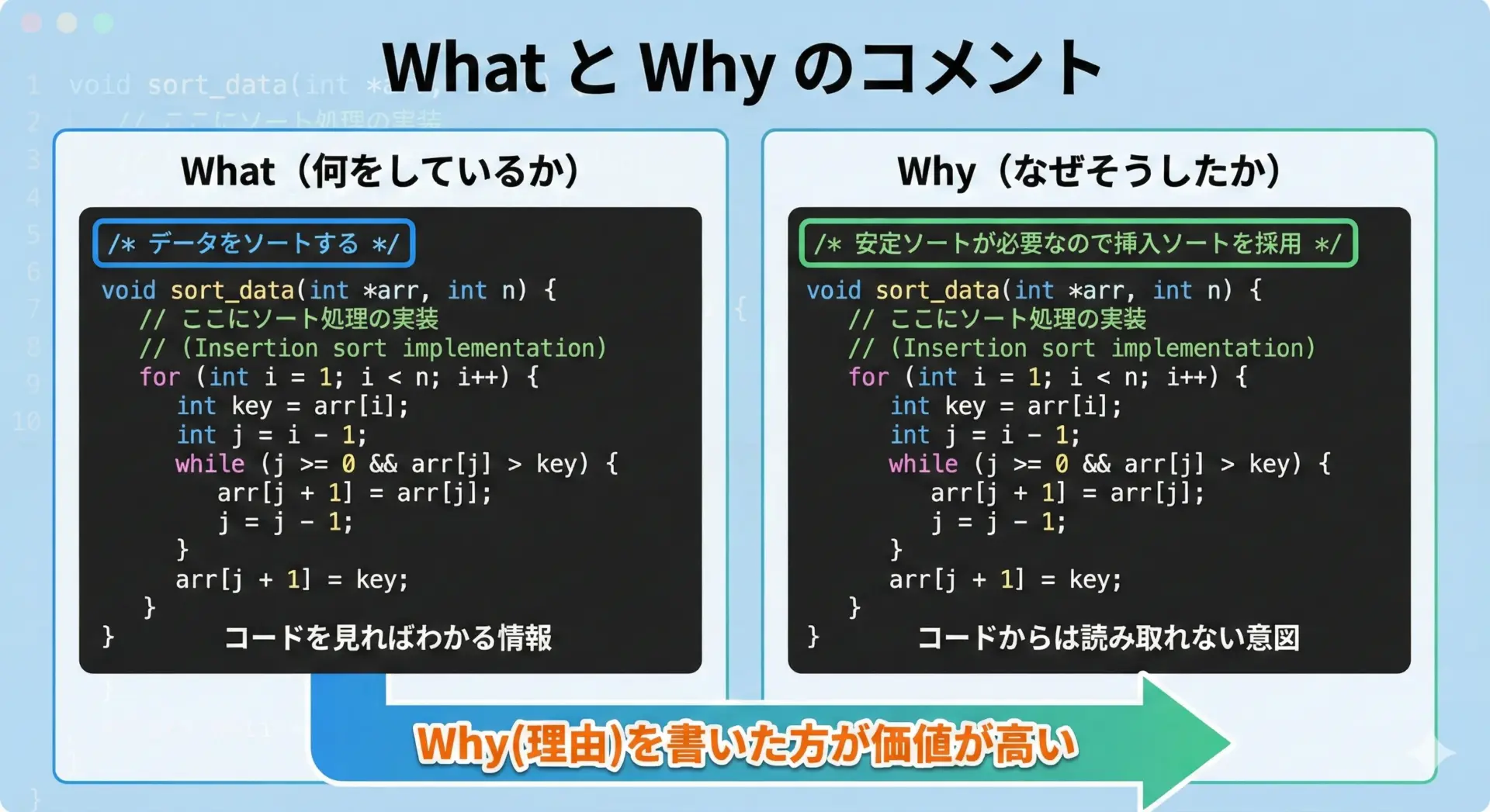 コードから読み取れる内容をなぞるコメントは避け、「理由」や「背景」に限定します。