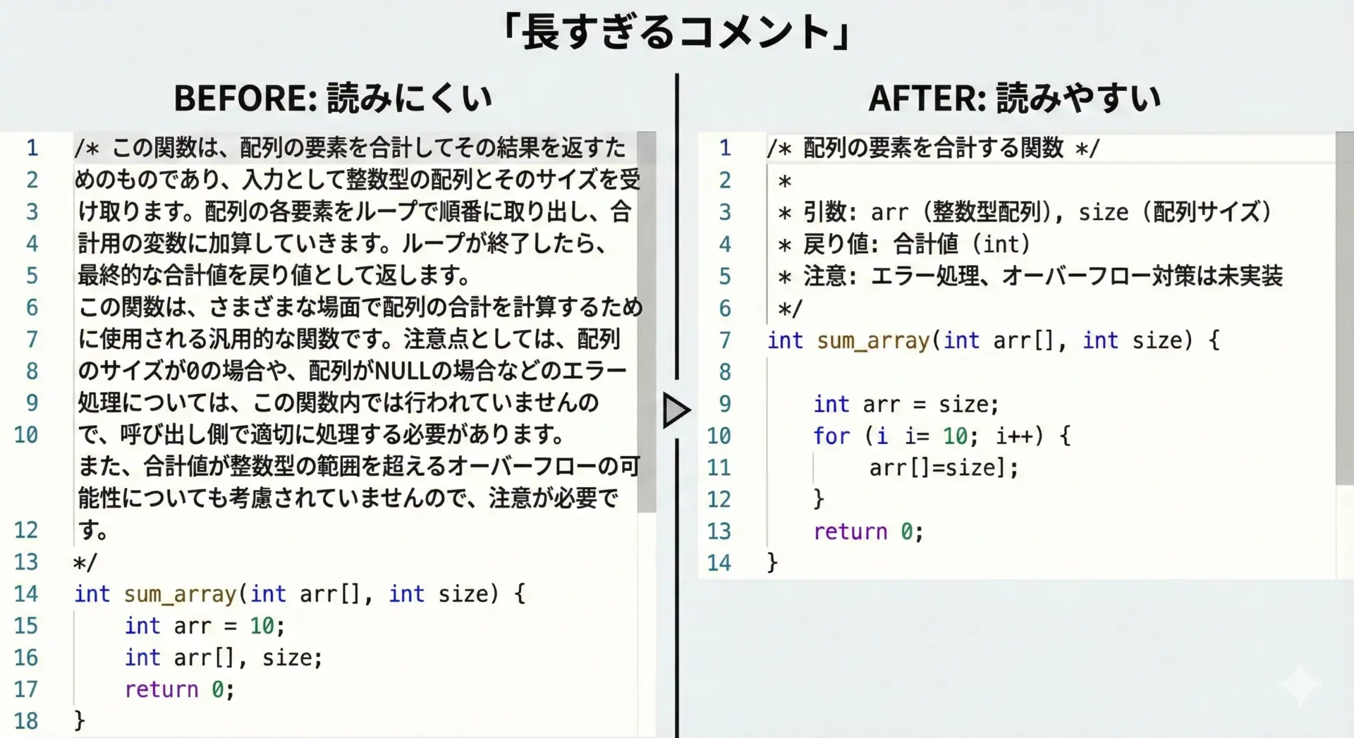 行レベルのコメントは、本当に必要な場合に限るのがポイントです。