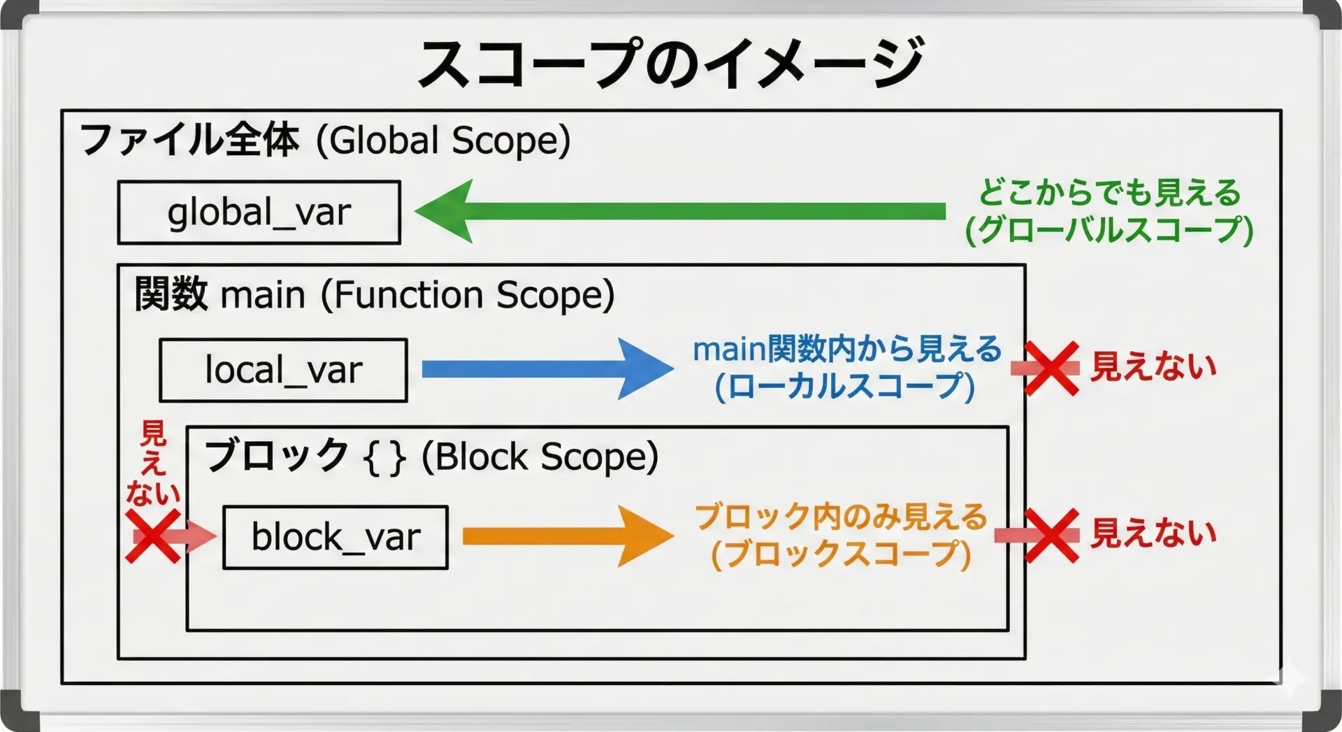 C言語では主にローカル変数グローバル変数の2種類を理解しておく必要があります。