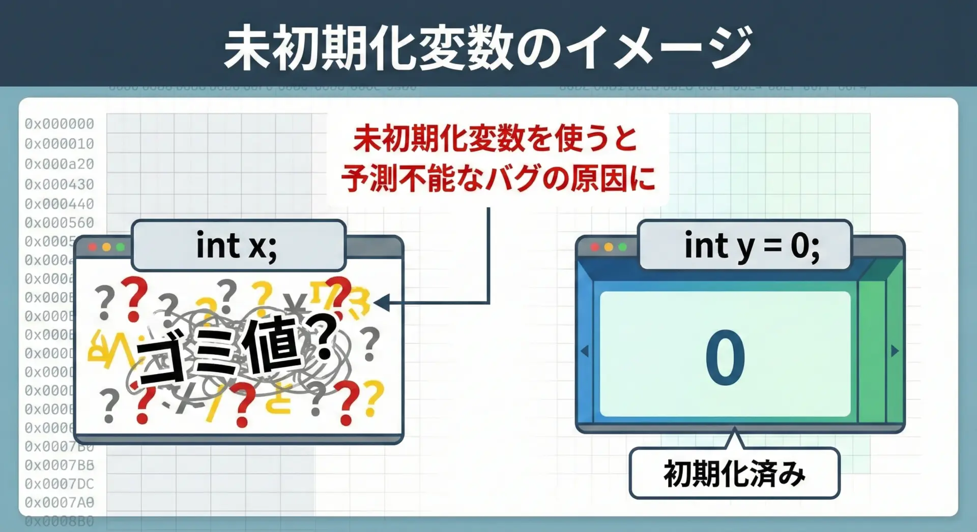 初期化を行わないと、ローカル変数の中身は「不定値」(何が入っているかわからない状態)になり、後から使用したときに予測不能な動作を引き起こします。