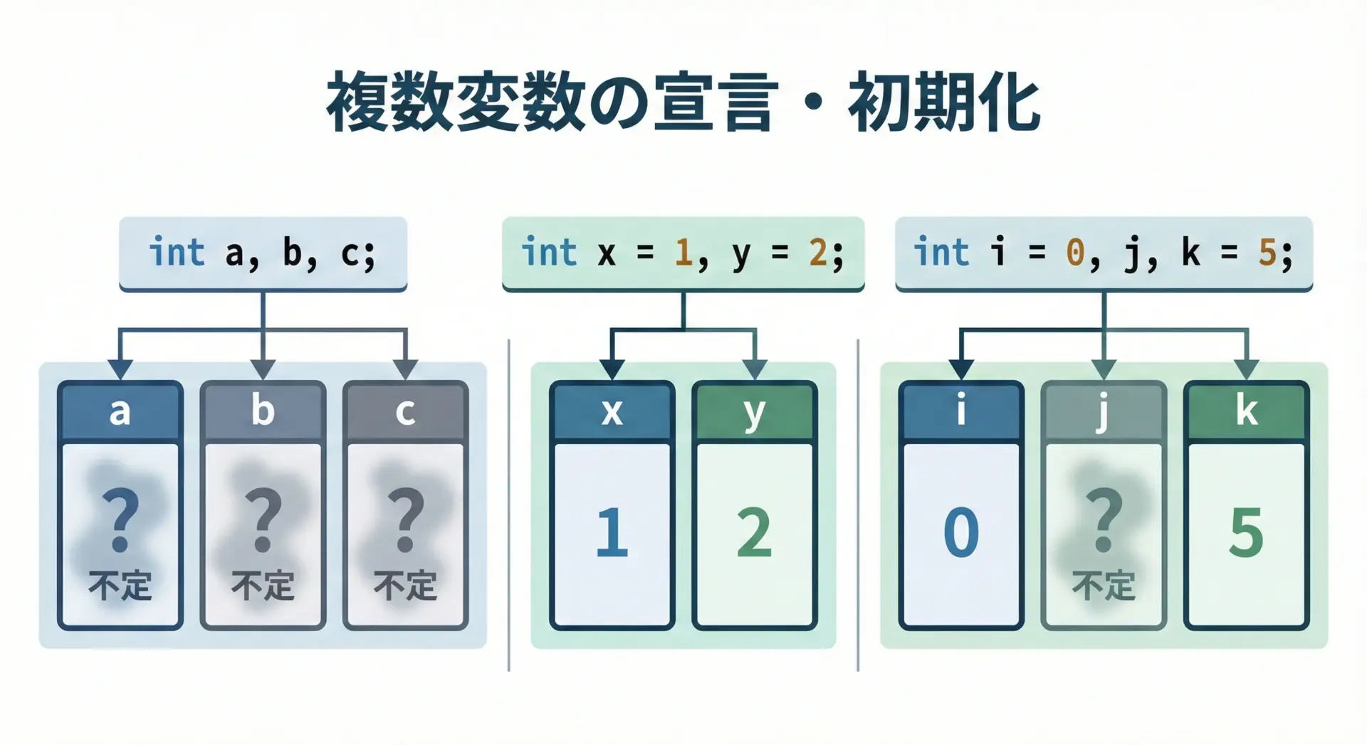 int a = 1, b = 2, c = 3;        // 3つを同時に宣言・初期化