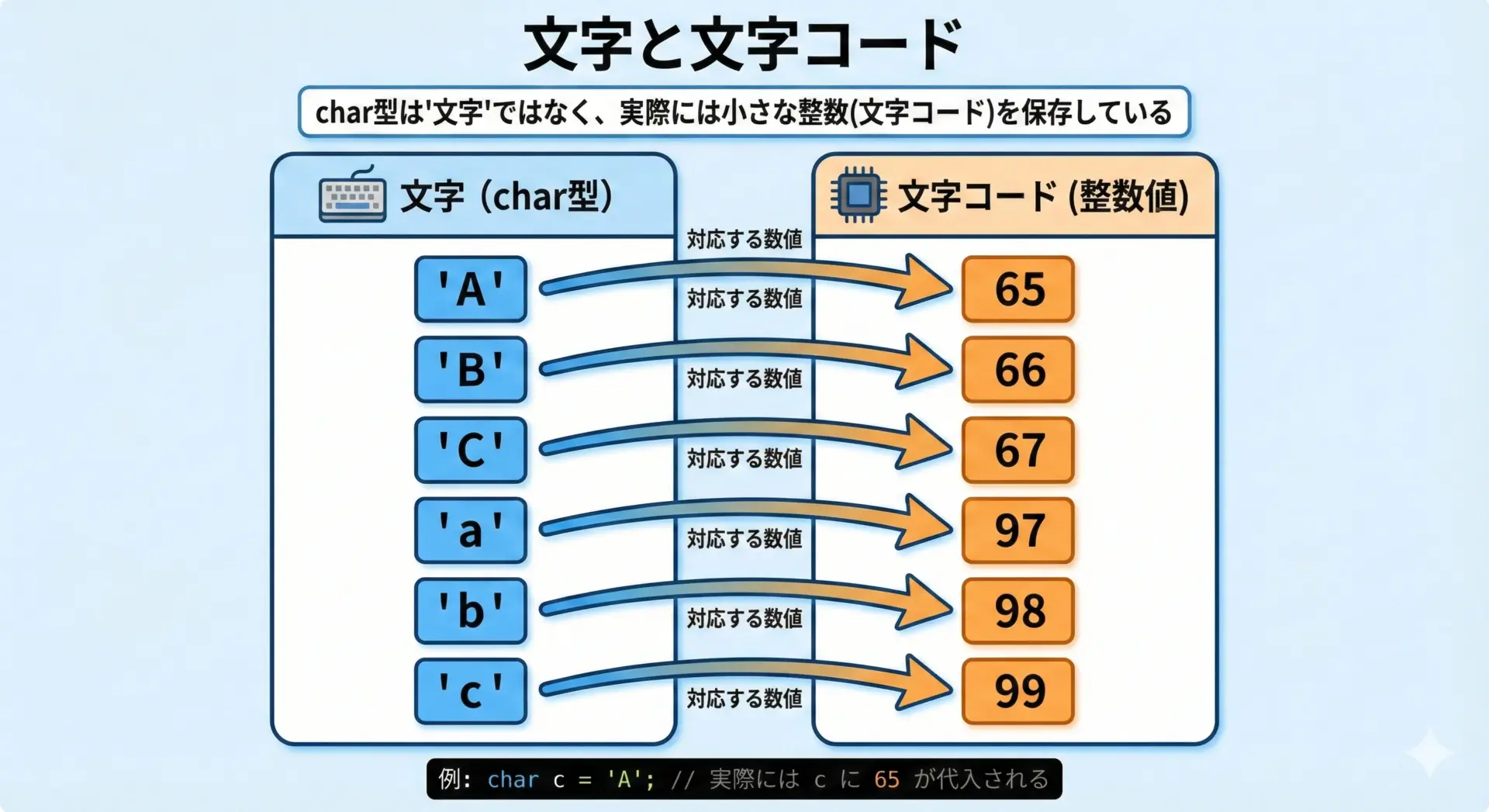 ただし、内部的には整数として文字コードを保存しているという点が重要です。