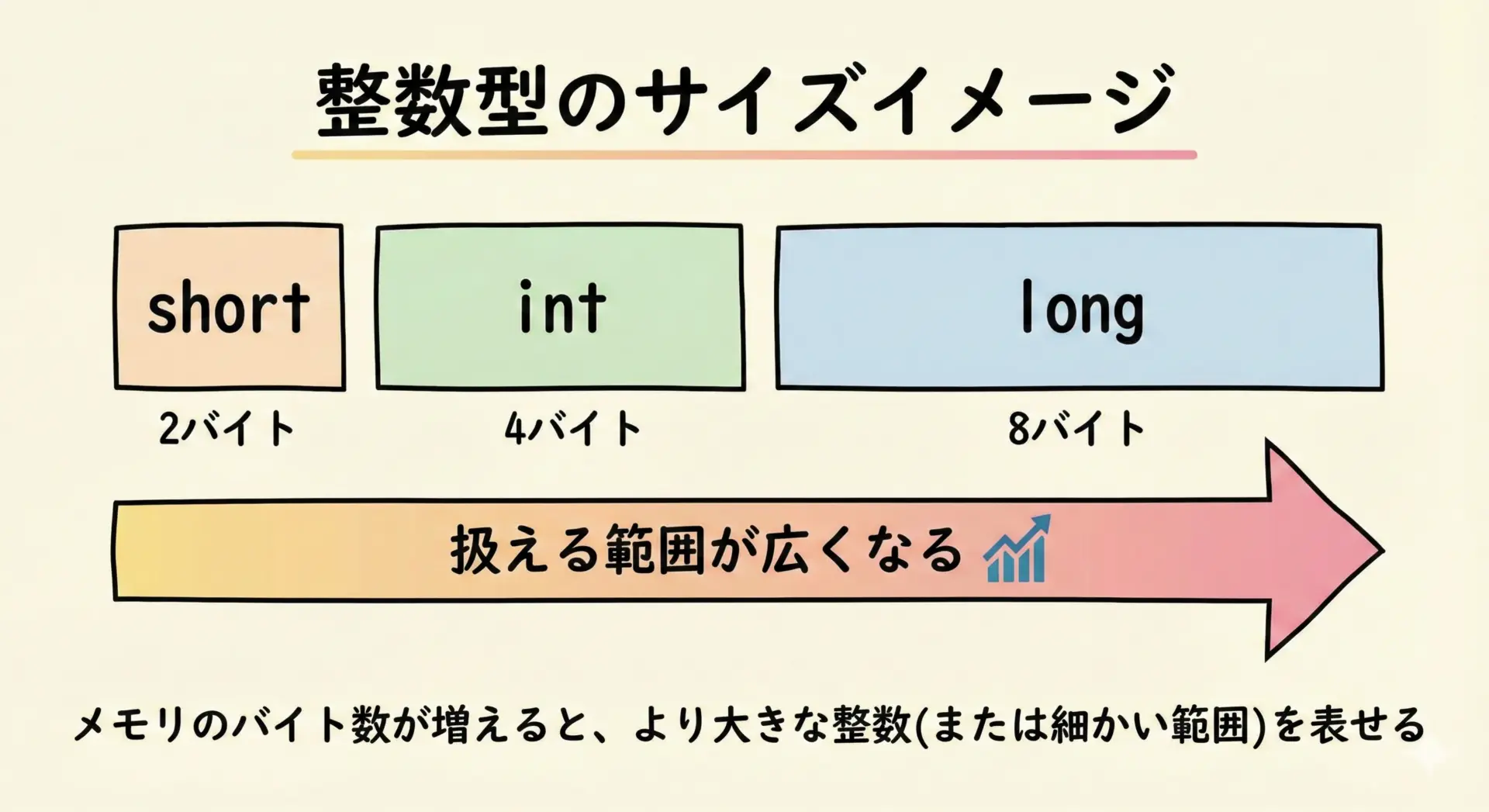 整数型の主な違いは、メモリ上で使用するバイト数と、表現できる値の範囲です。