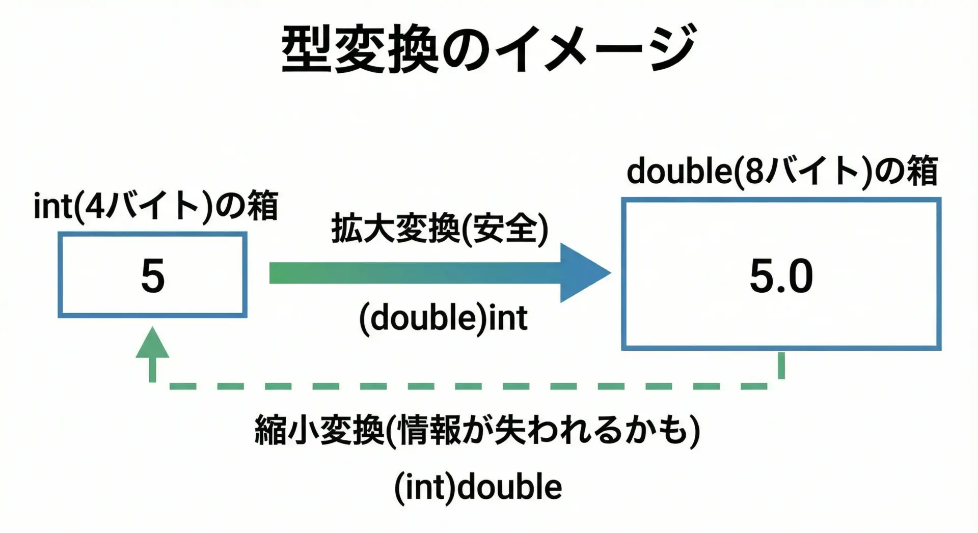 • 明示的な型変換(キャスト) … プログラマが(int)などと書いて指定する変換